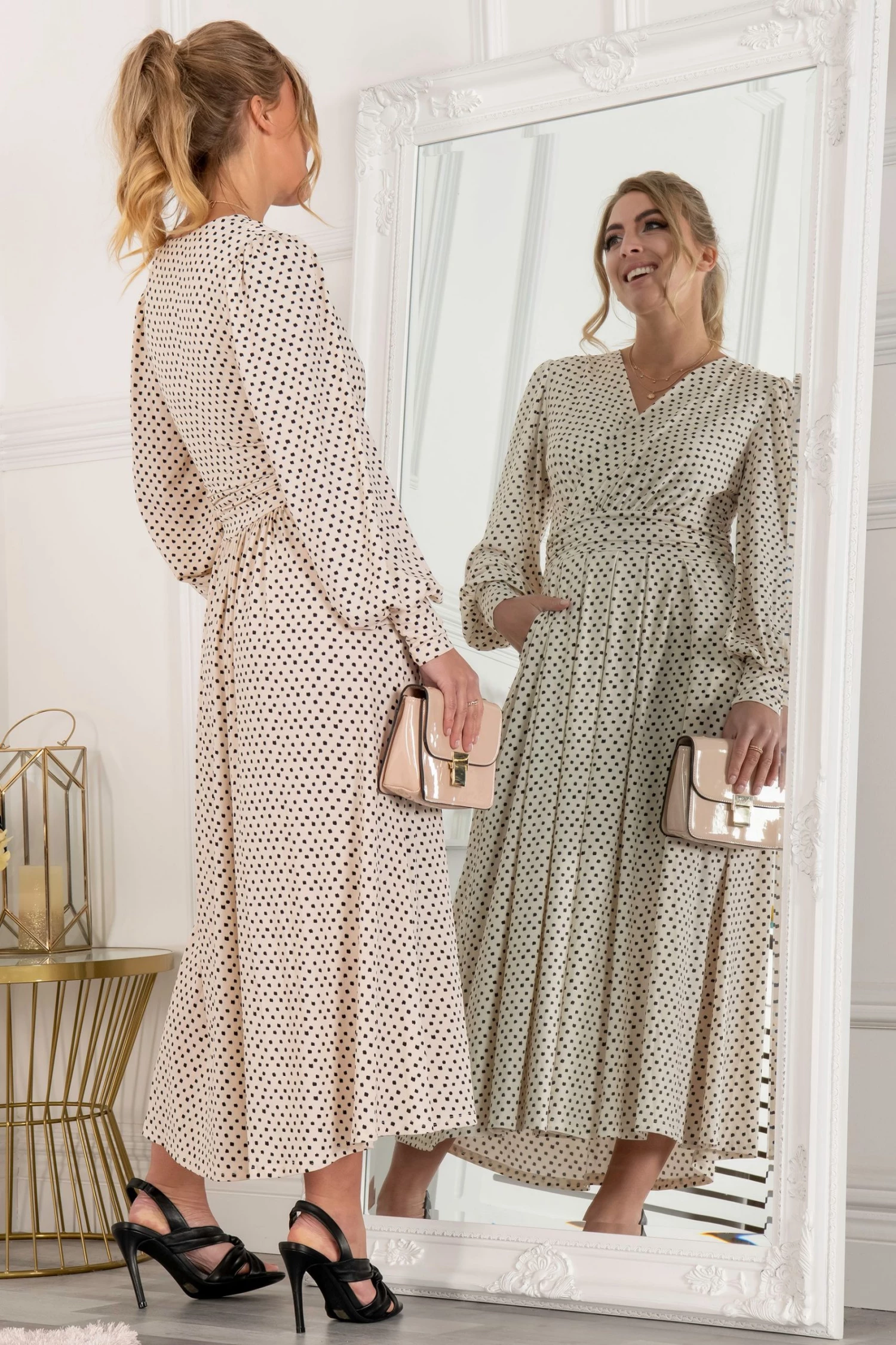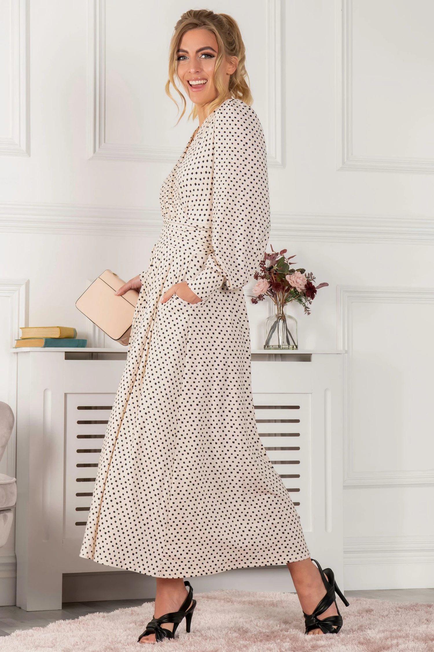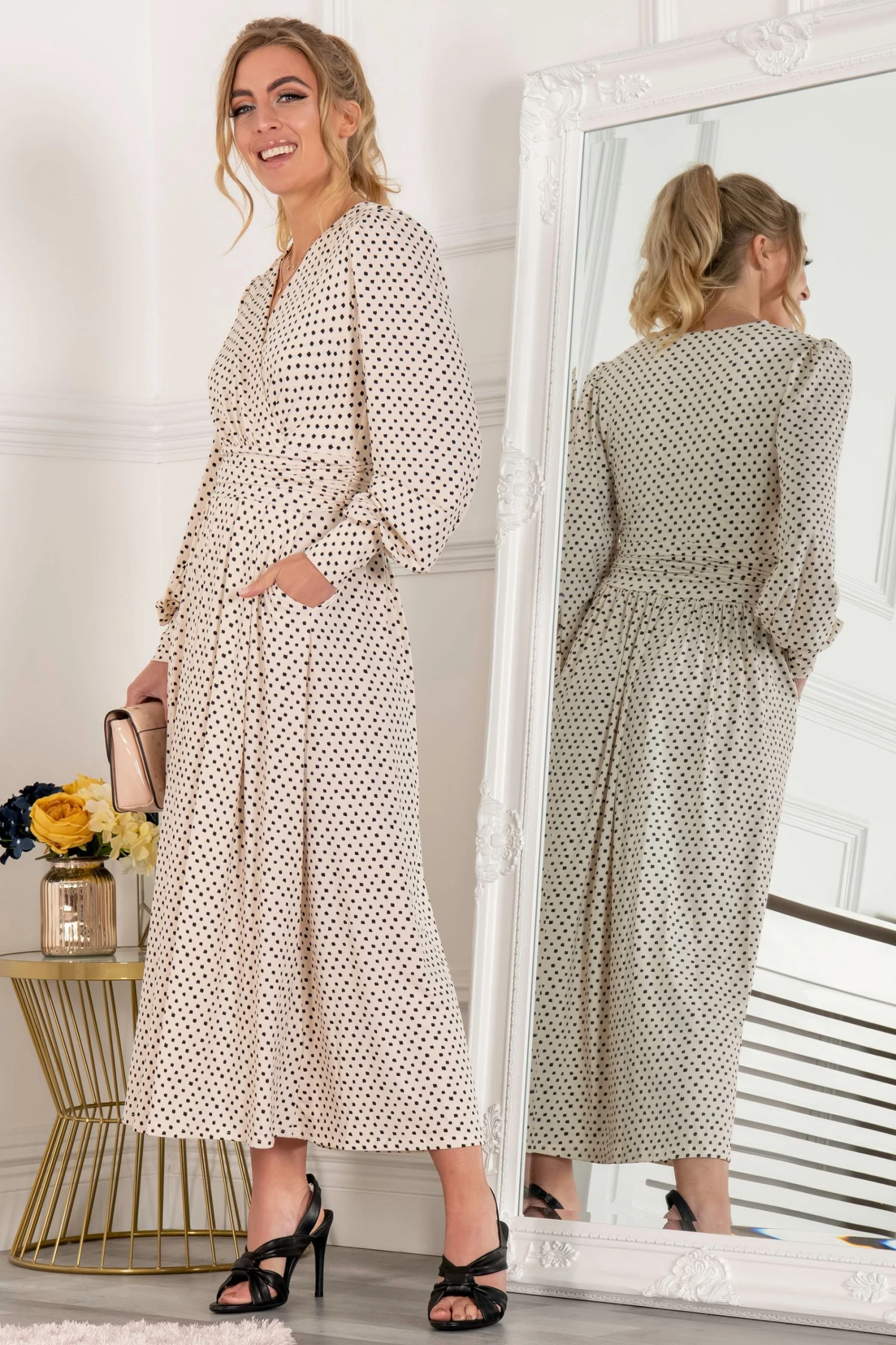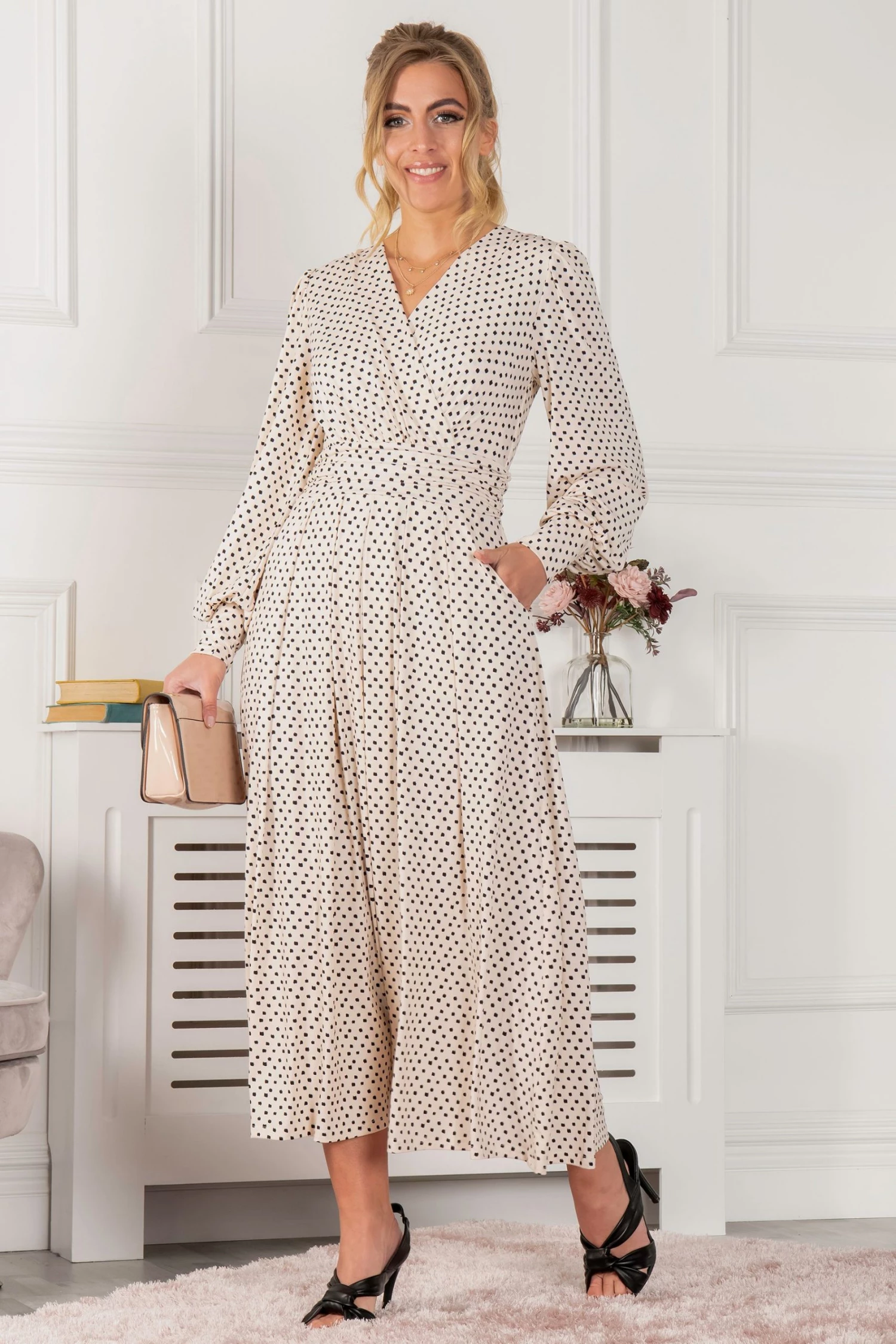 Elegant from head to toe, this dress from Jolie Moi features a simple but distinctive polka dot pattern that will draw everyone’s attention to you. Versatile with its elegant wrap over V-neckline and smart long sleeves, it is completed with functional pockets and a ruched elasticated waistband which draws in your silhouette for a form-flattering fit.
