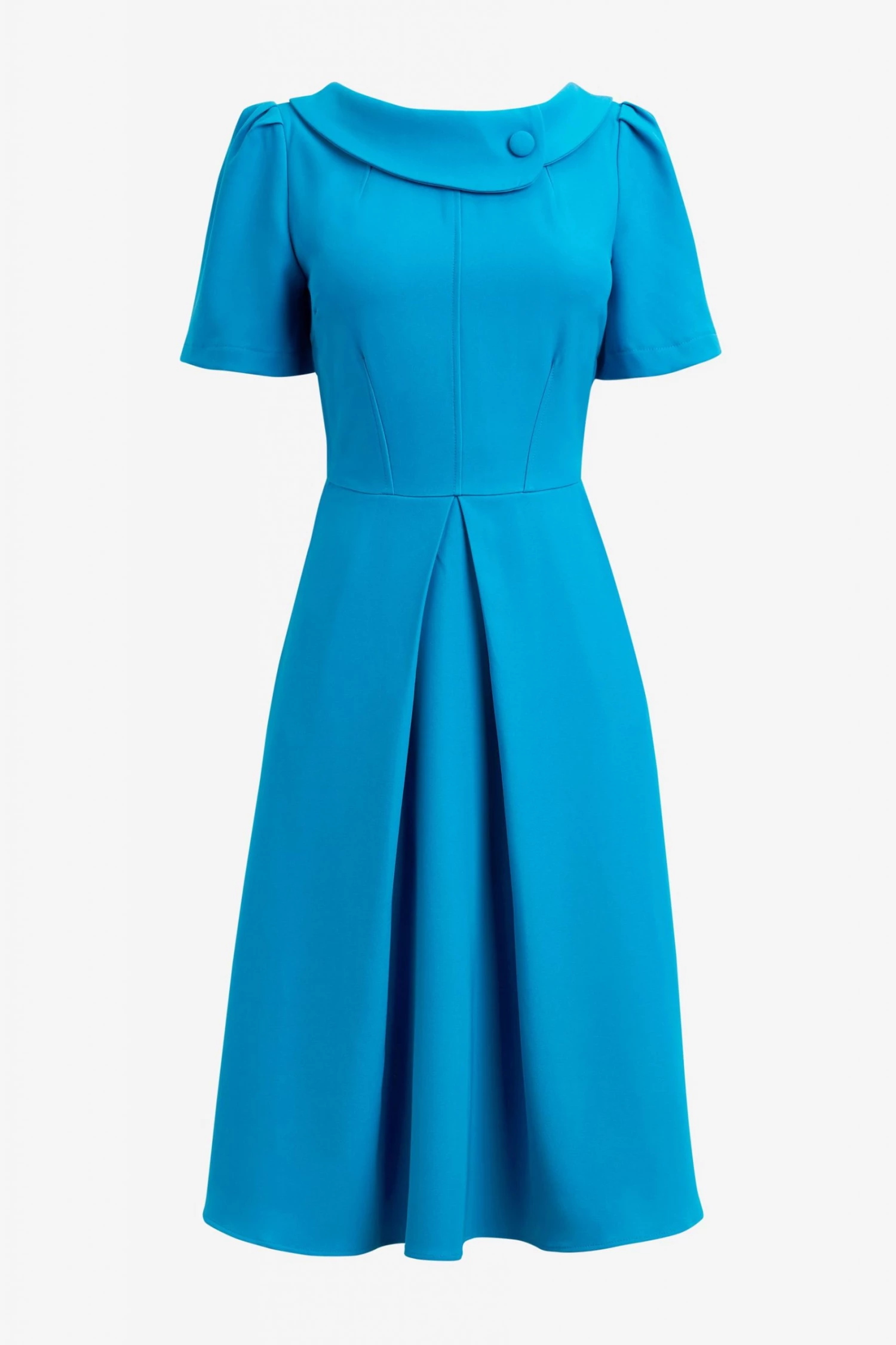 This 50s style dress from Jolie Moi is retro-inspired. Designed in a contemporary structured silhouette and crafted from luxury ponte-de-roma viscose fabric with a hint of stretch. This fit and flare dress is designed with a statement asymmetric boat line collar with a smart button. Fully lined for comfort, it’s completed with a concealed back zip, short sleeves and a cinched waistline for a true to size fit.