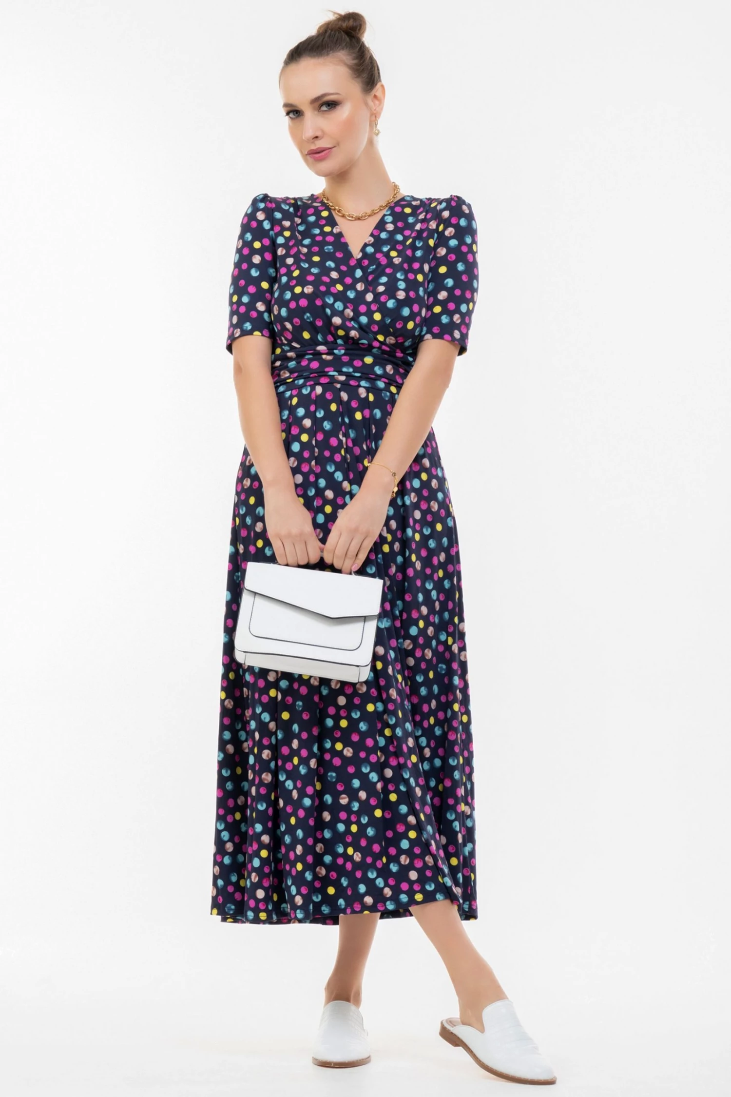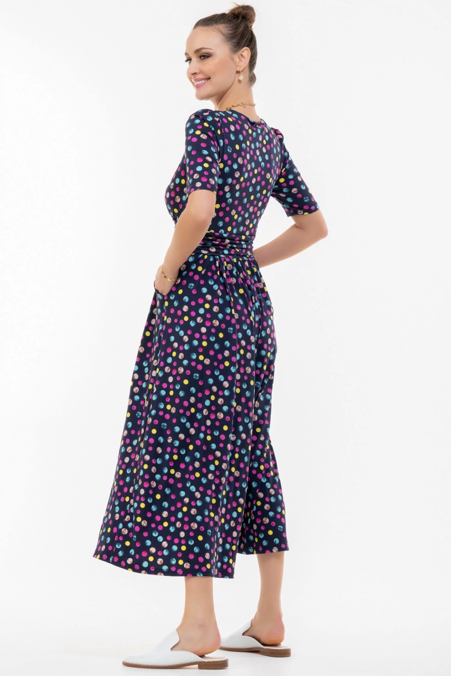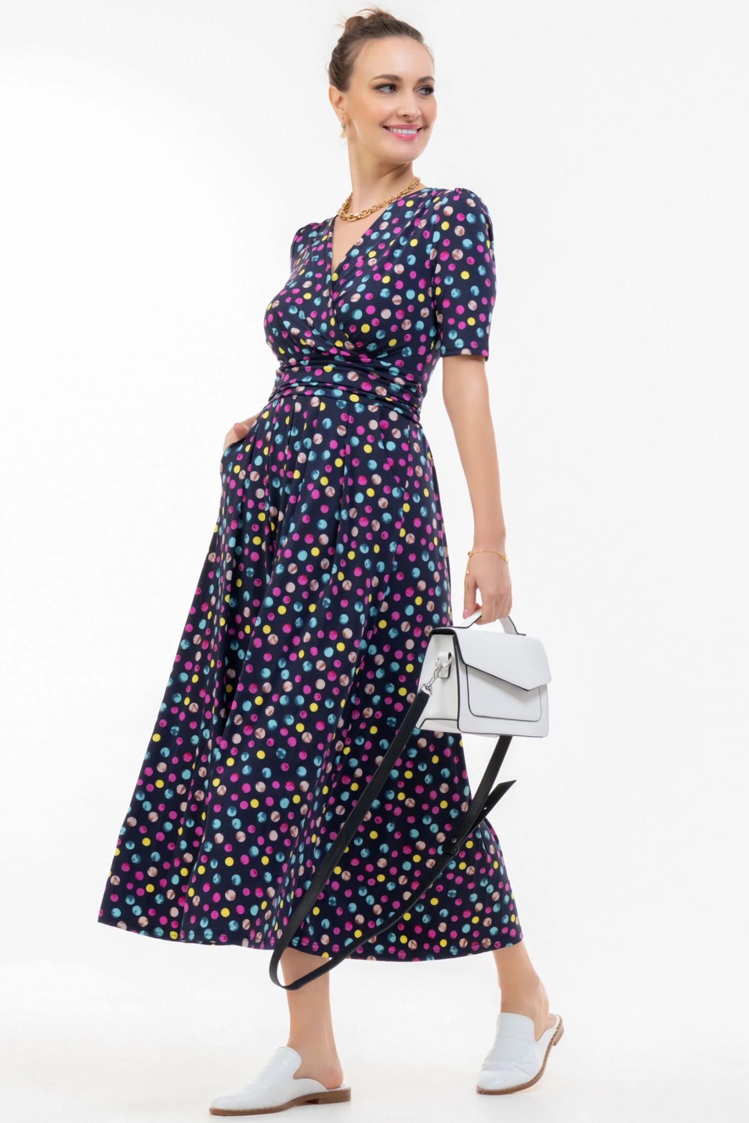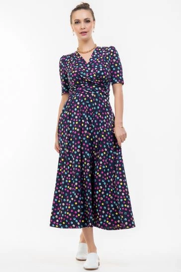 Cut from comfortable stretchy jersey fabric, this wrap front V-neck dress is designed with a ruched elasticated waistband which draws in your silhouette for a form-flattering fit. Finished with side pockets and pull on fastening for easy wear, it is a care-free option for wherever the day takes you.