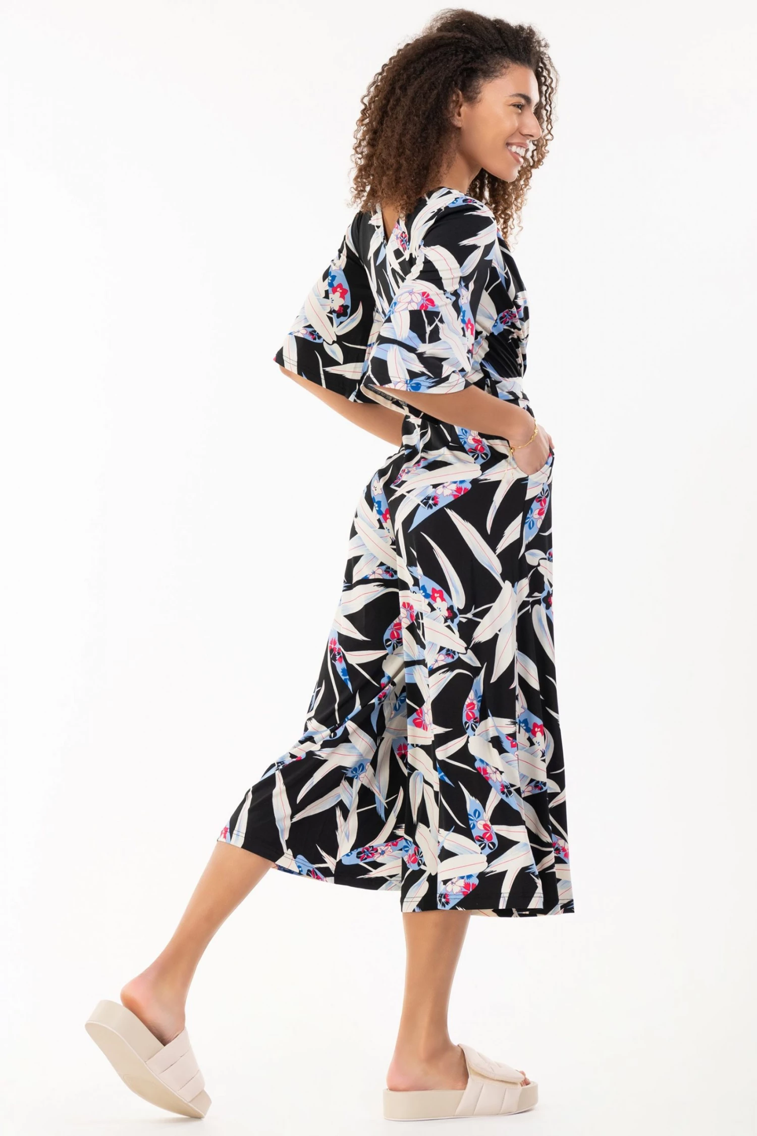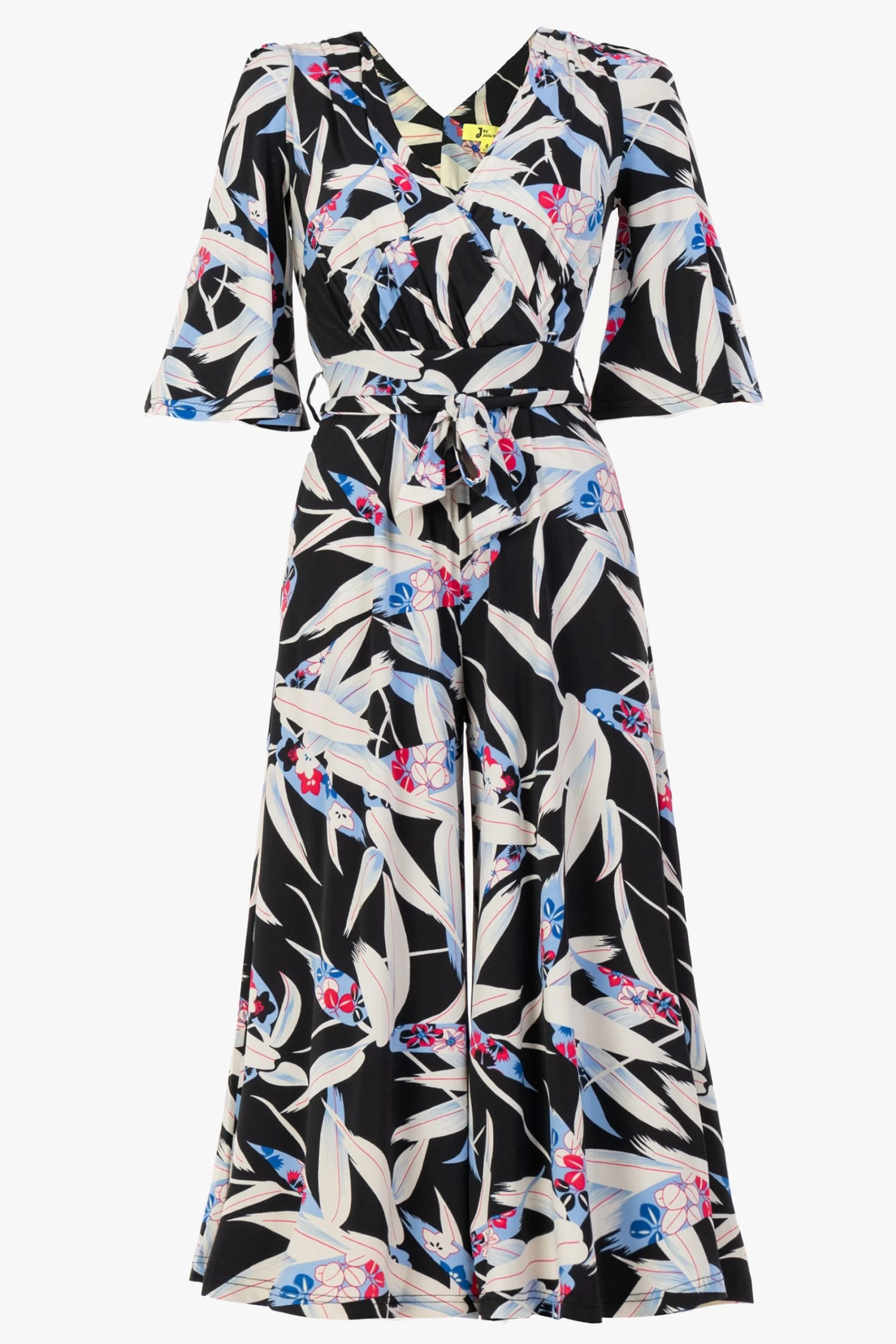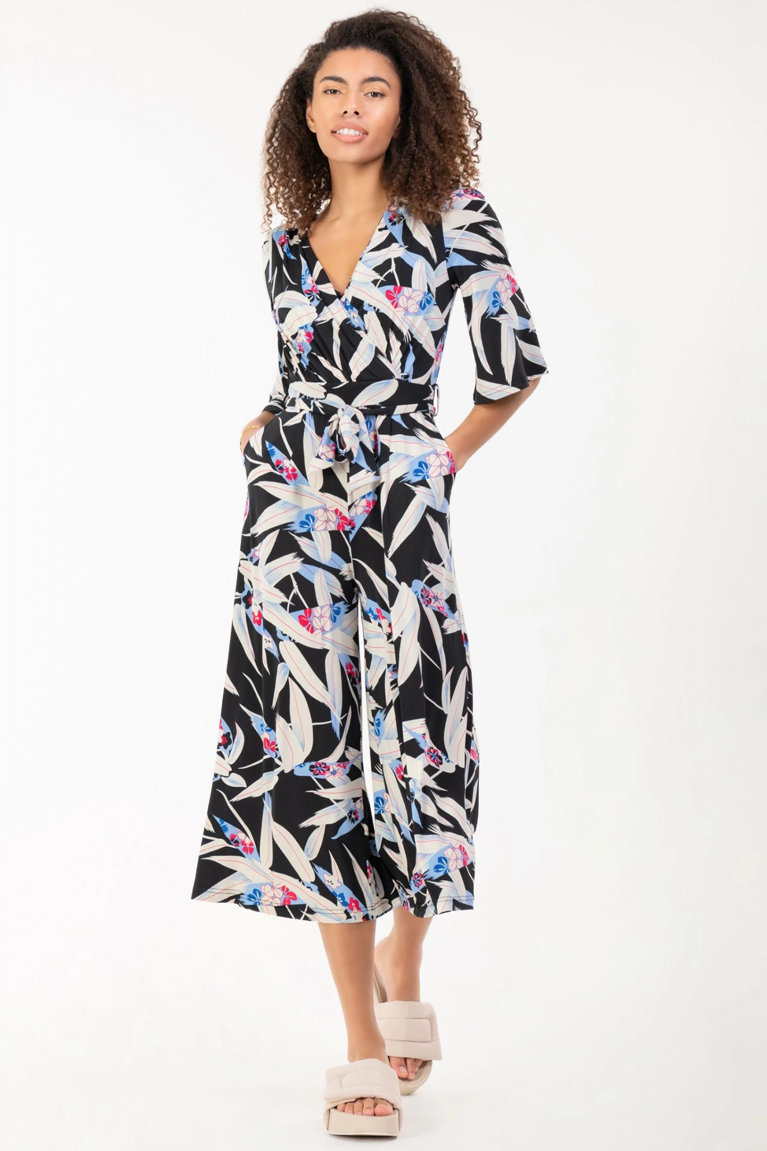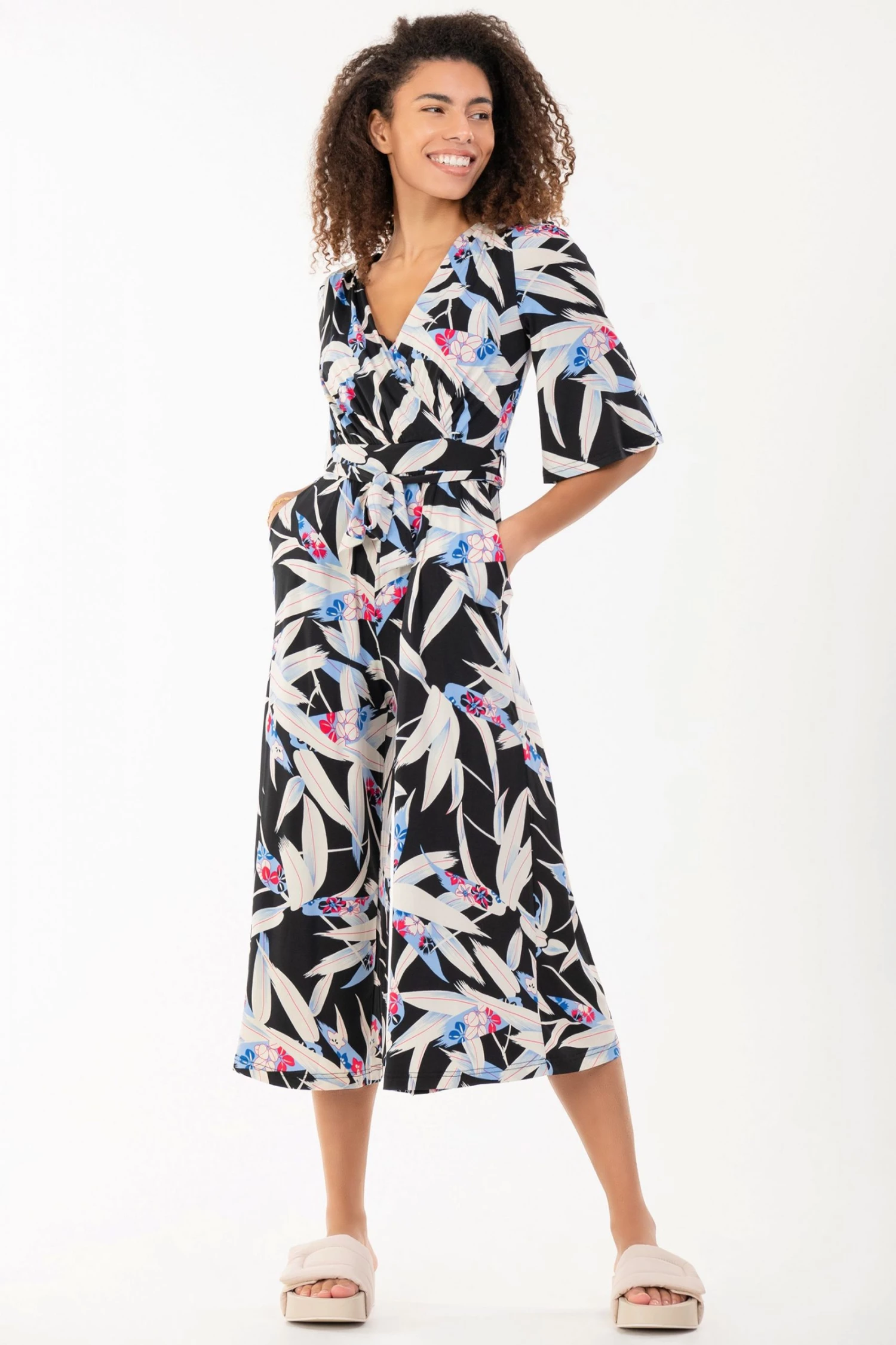 Fashioned from signature soft and stretchy jersey fabric with a bold leaf print all over, this relaxed culotte style jumpsuit from Jolie Moi comes with a belt that can be used to enhance the waist. The cross-over V-neck runs into a ruched elasticated waistband that draws in your silhouette for a form-flattering profile. Finished with flared sleeves and two side pockets for easy wear, pair with your favourite slider sandals or trainers with a biker jacket for an added edge.