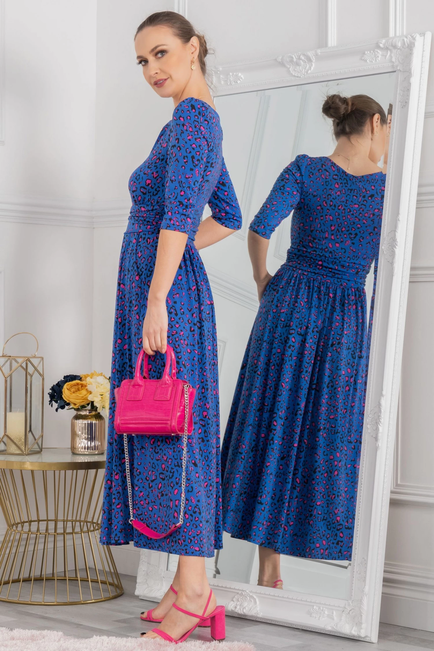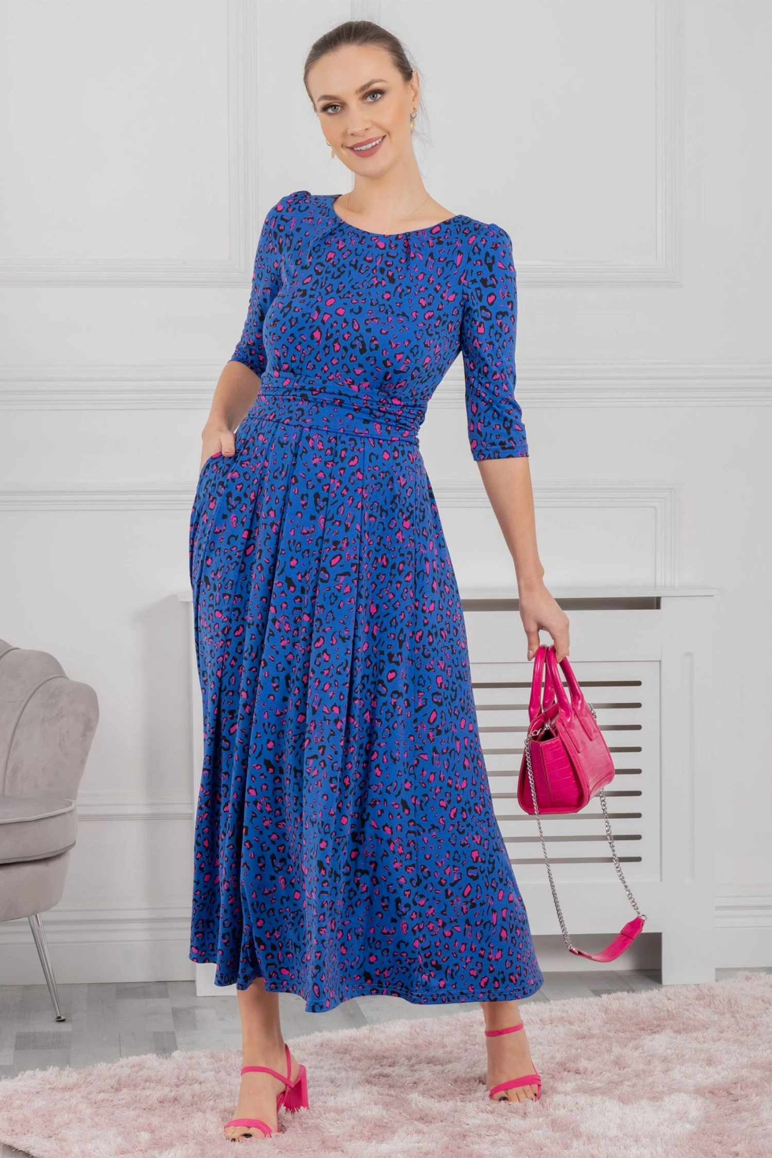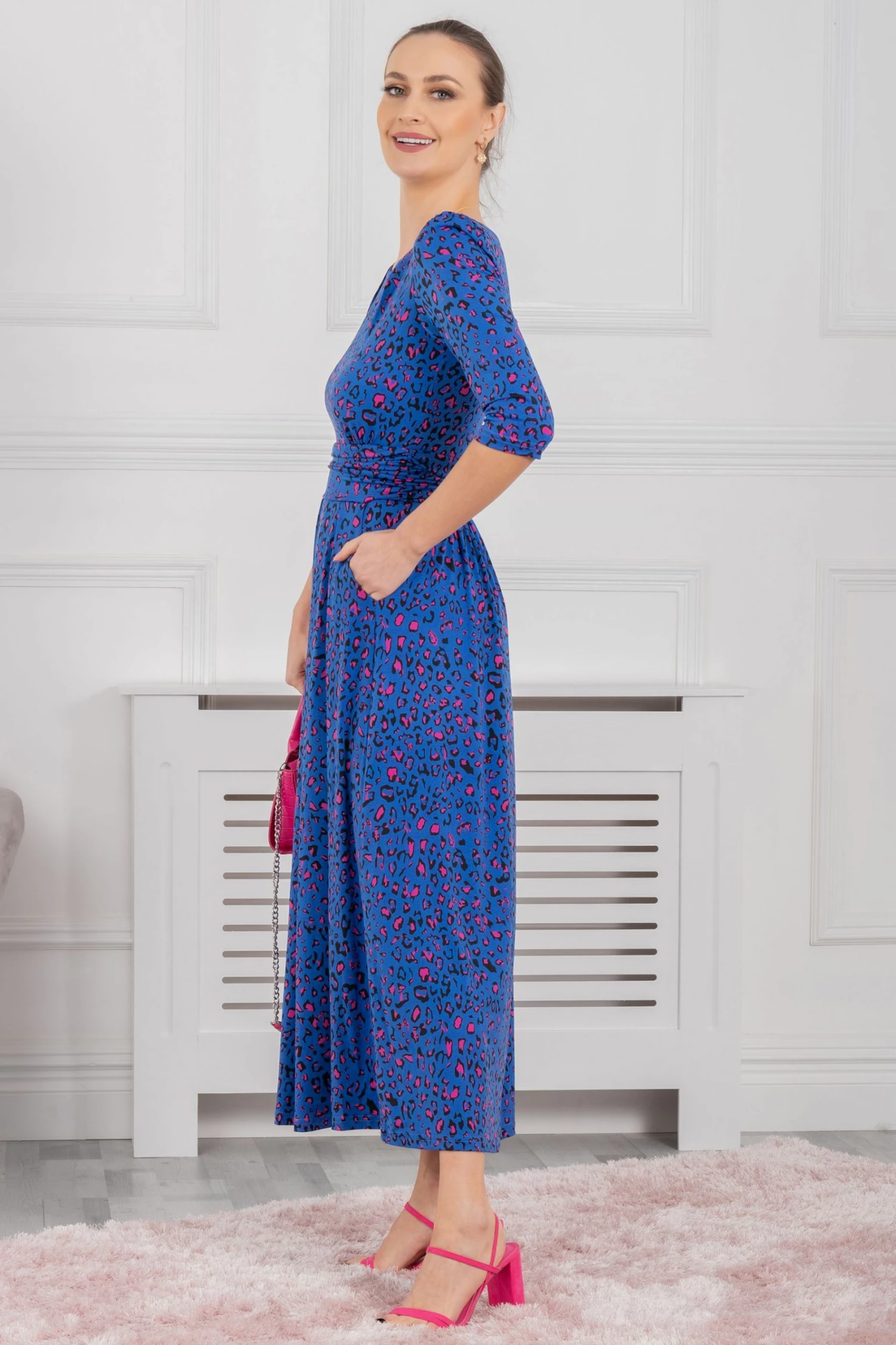 Cast a flowing silhouette in this dress from Jolie Moi. Topped with a boat neckline and three-quarter length sleeves and finished with side pockets for easy wear, it is cut from jersey fabric for a soft, comfortable feel and is a sophisticated option for special occasions.