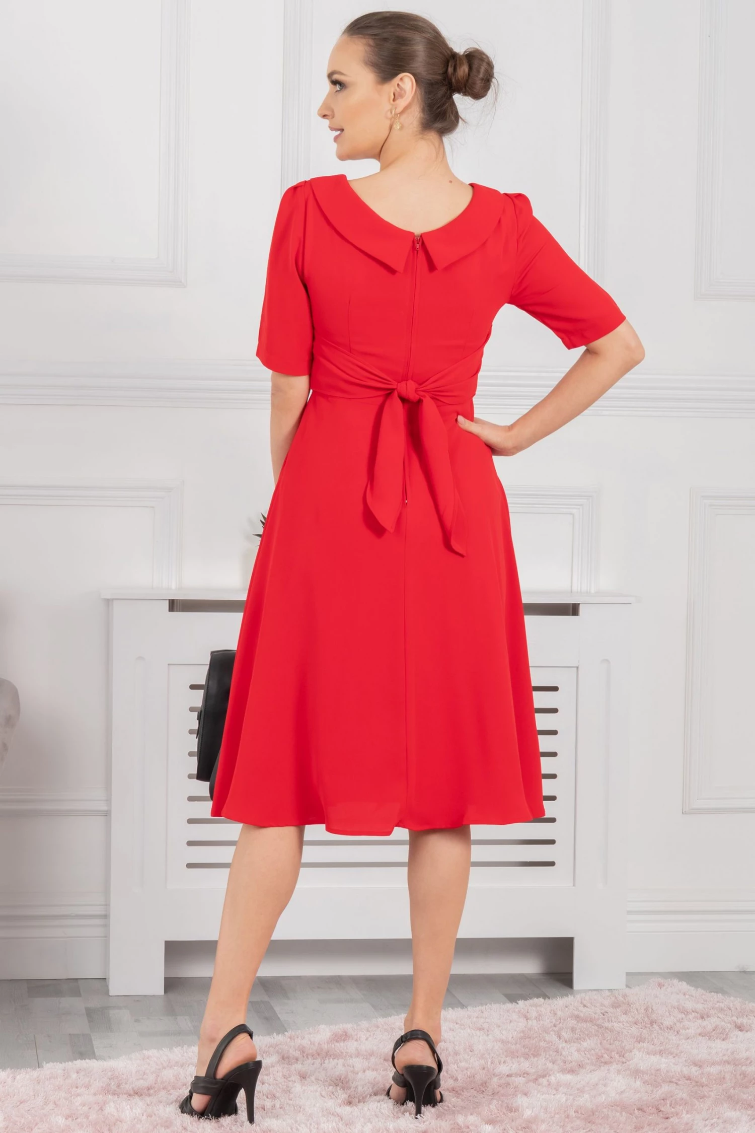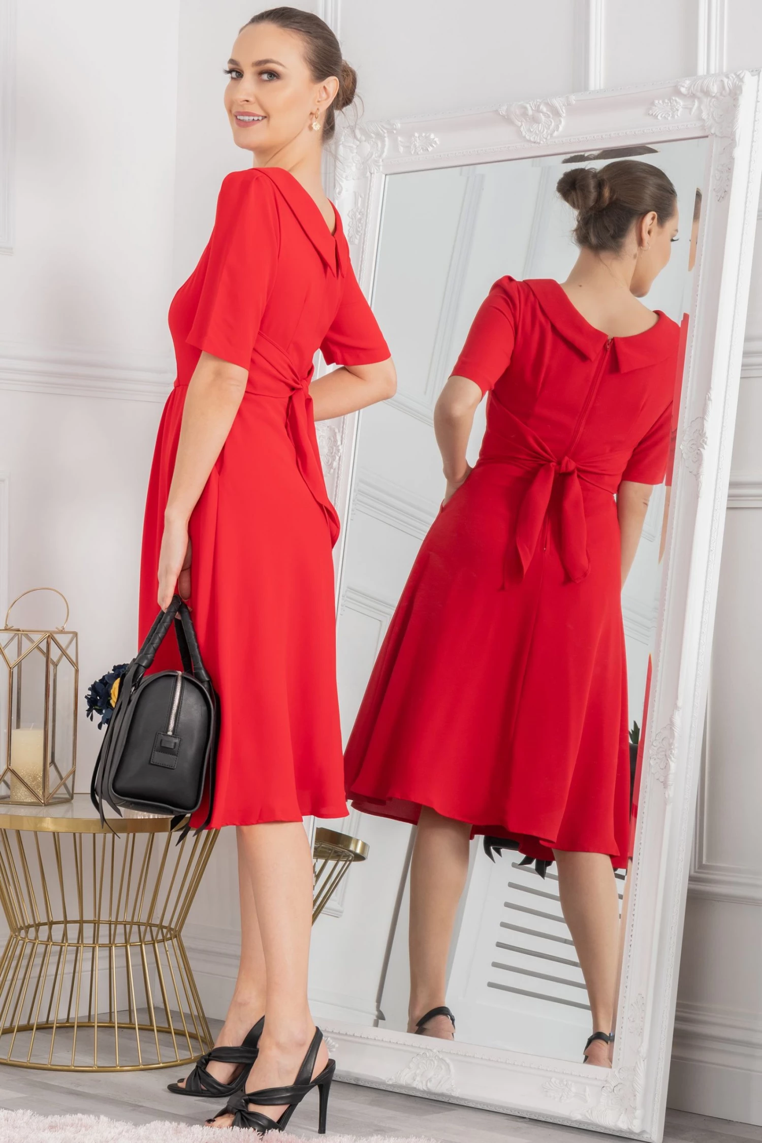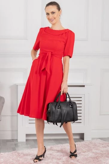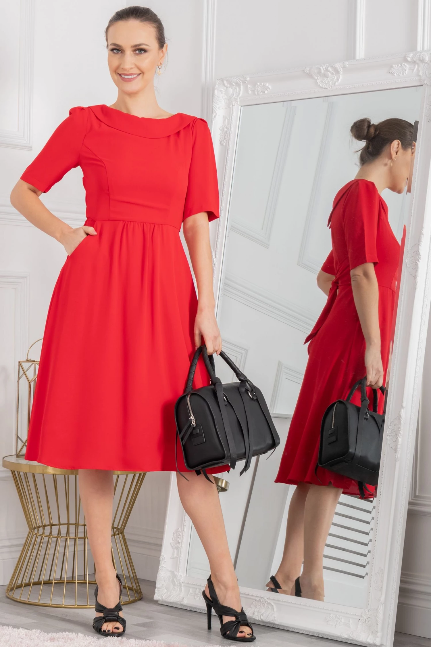 Flaring out at the hem for a 50s style aesthetic, this knee-length dress by Jolie Moi is free from any fussy details. Topped with a boat neckline, elbow length sleeves and a beautiful fit and flare midi silhouette. The dress features a frilly belt that can be tied in the front or the back to give it that wrapped look. They are sure that you will want to reach for this dress on more than one occasion.