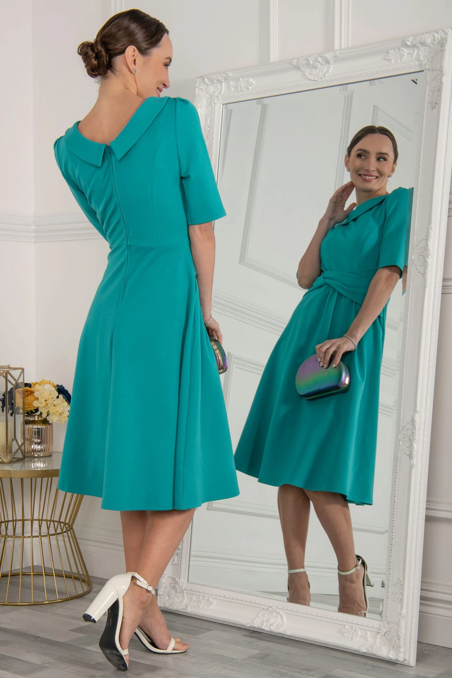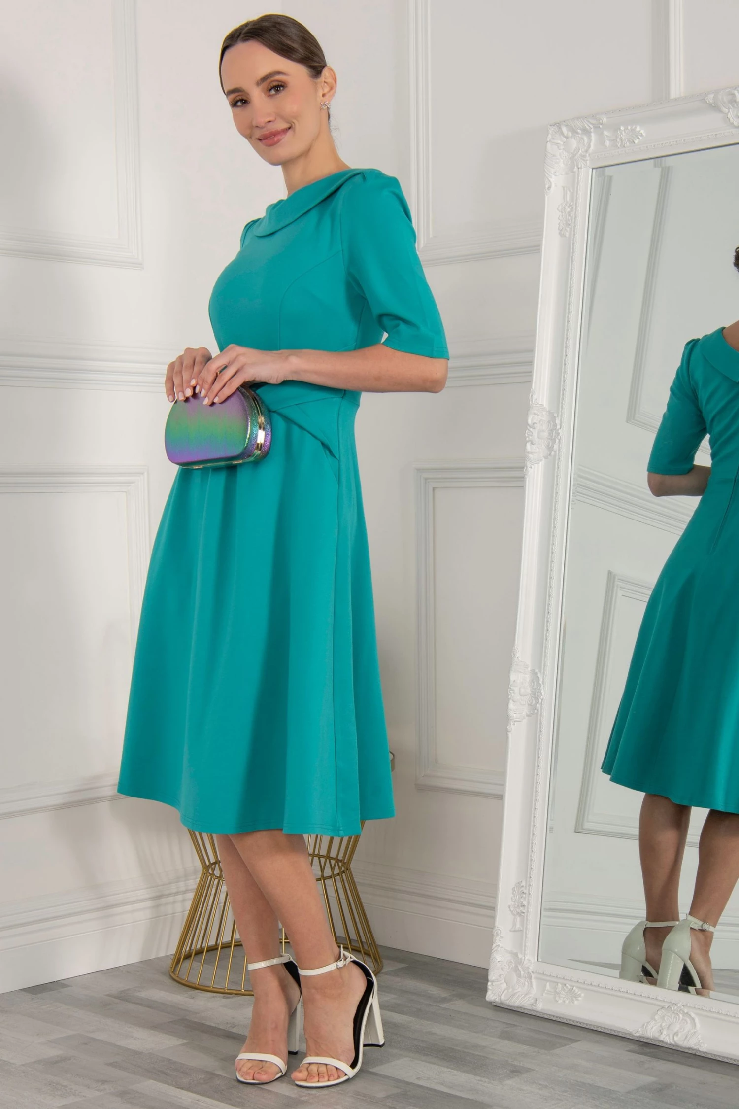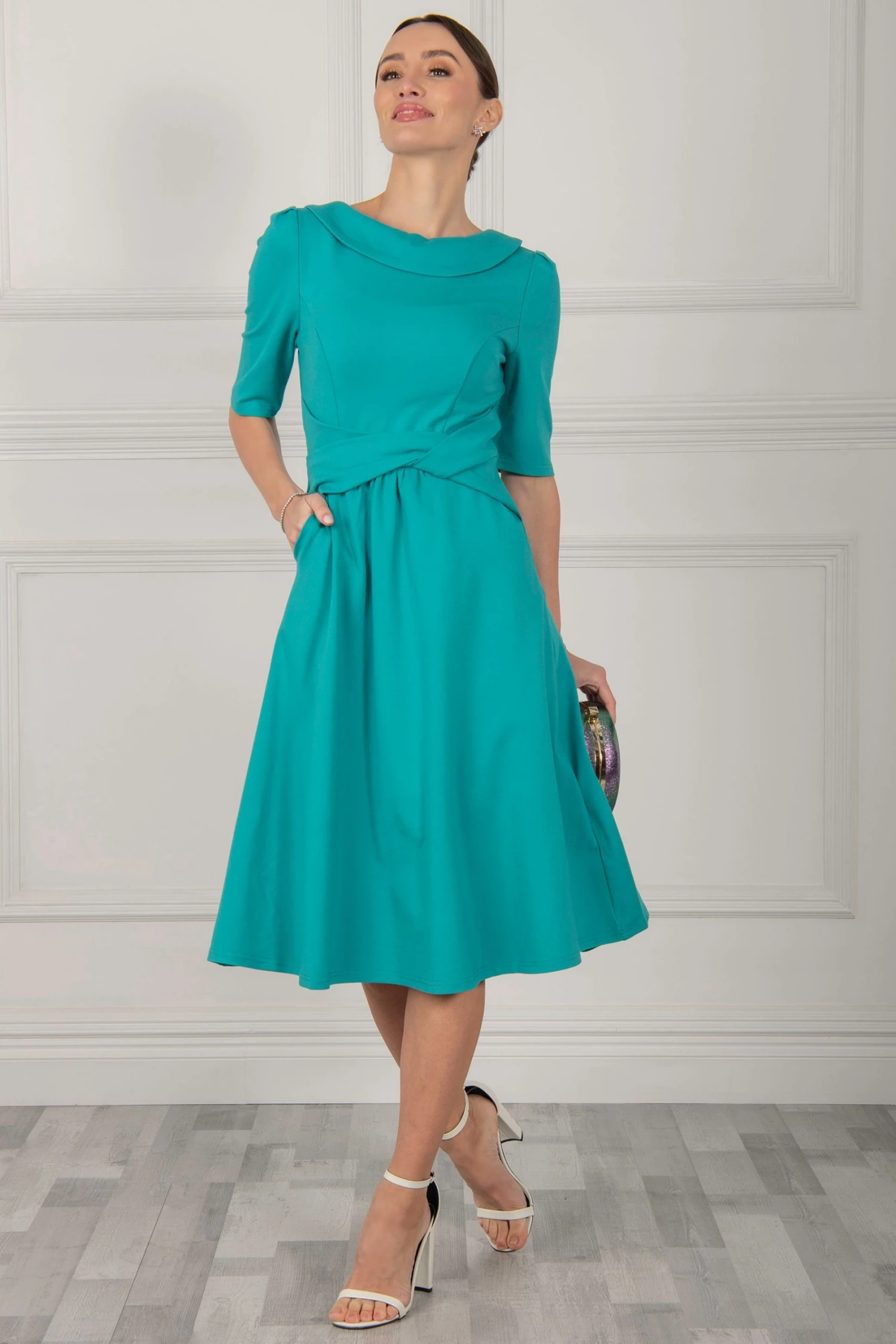 The Maayan midi dress features a folded collar design which accentuates the neck for a more glamorous look. This knee-length dress flares out at the hem for a 50’s aesthetic, features short sleeves, completed with a wrap look.