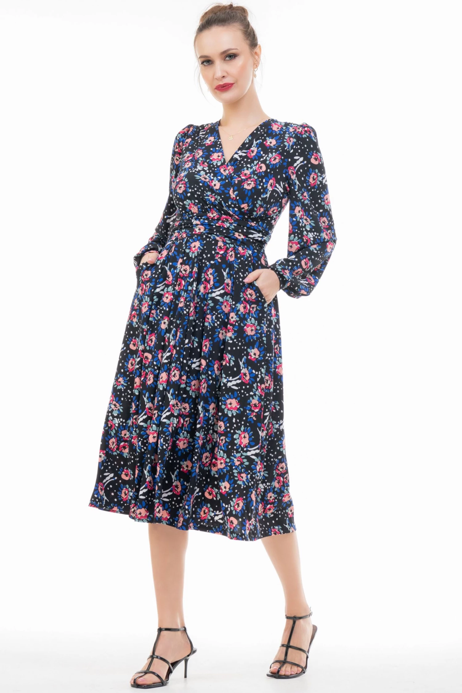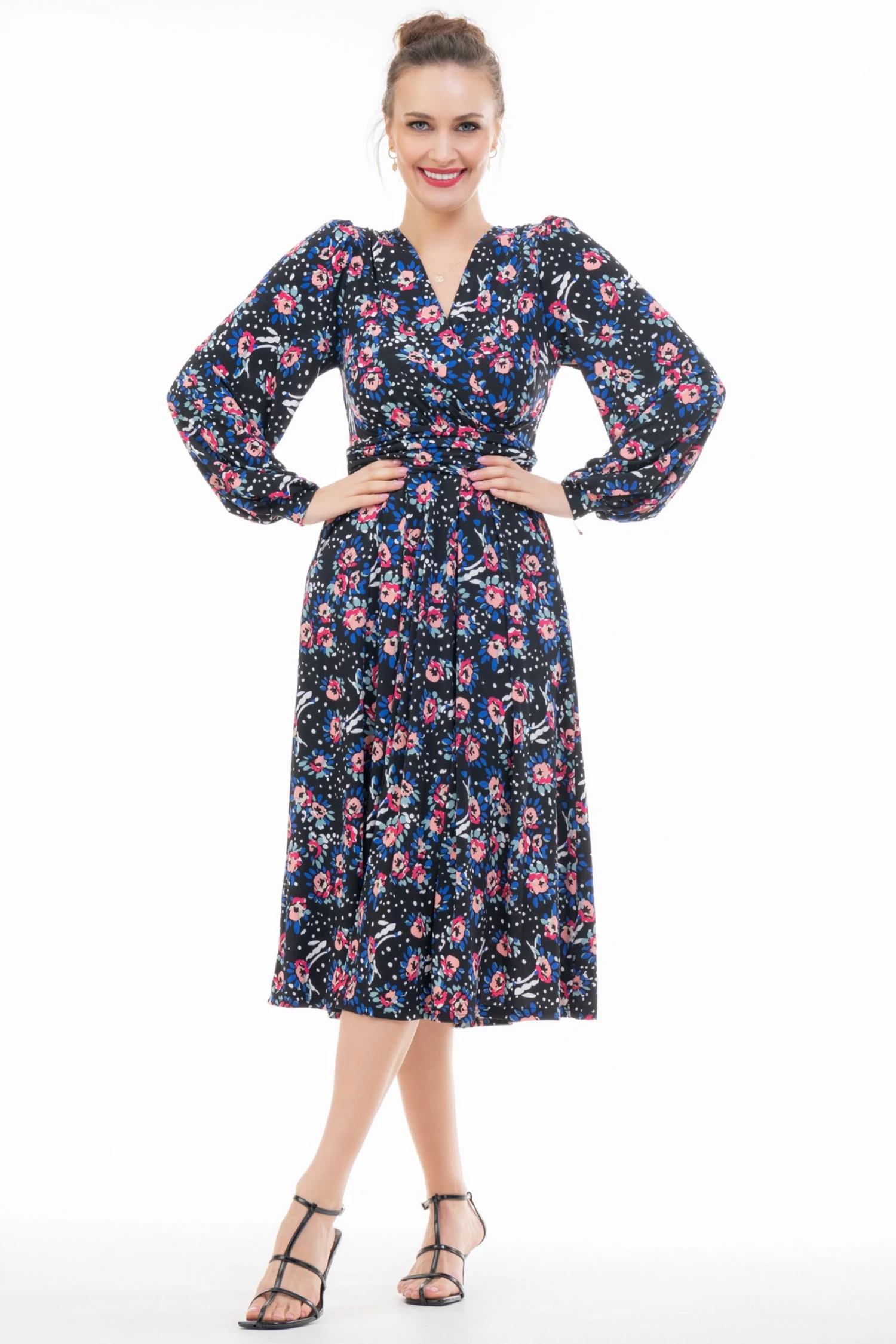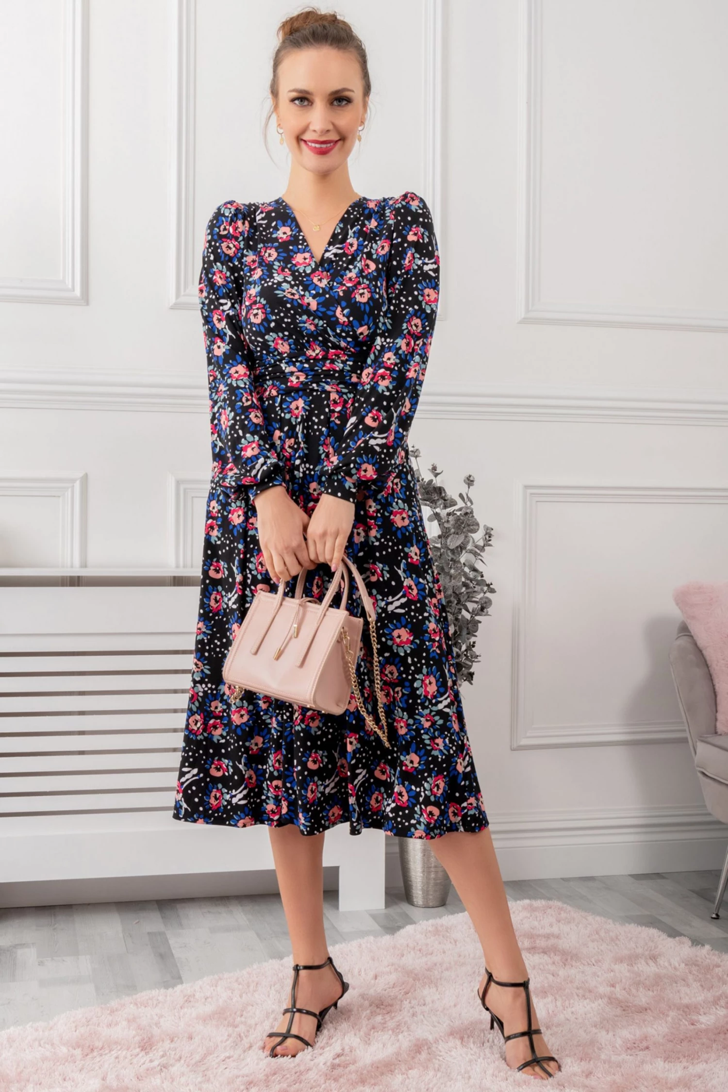 Complementing your shape with a wrap over front and puff long sleeves, this dress from Jolie Moi will become a real staple in your wardrobe. Flaring out at the hem for added movement, its elegant and stylish whilst having a pop of colour and youthful feel thanks to the contrast bold print that runs throughout.