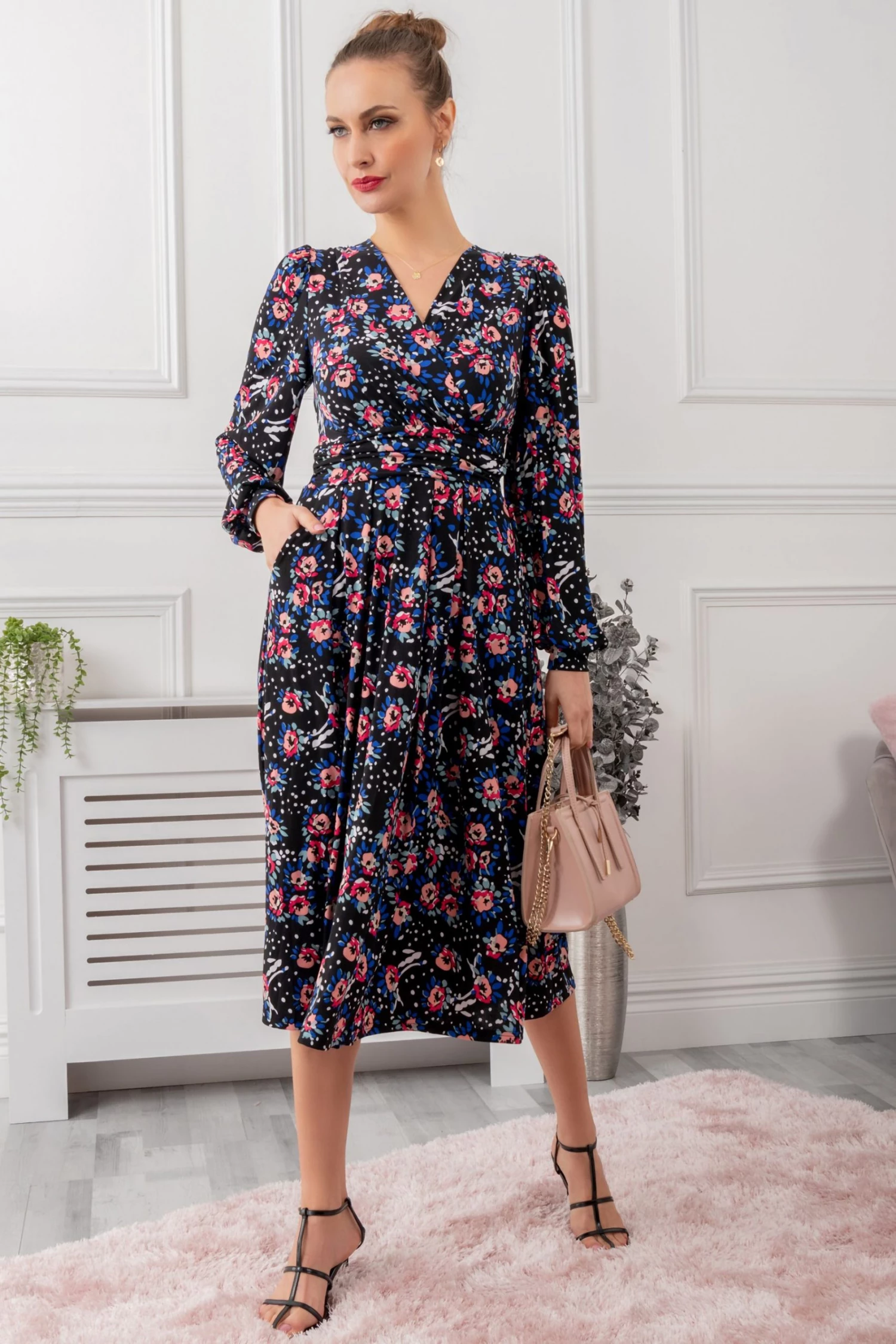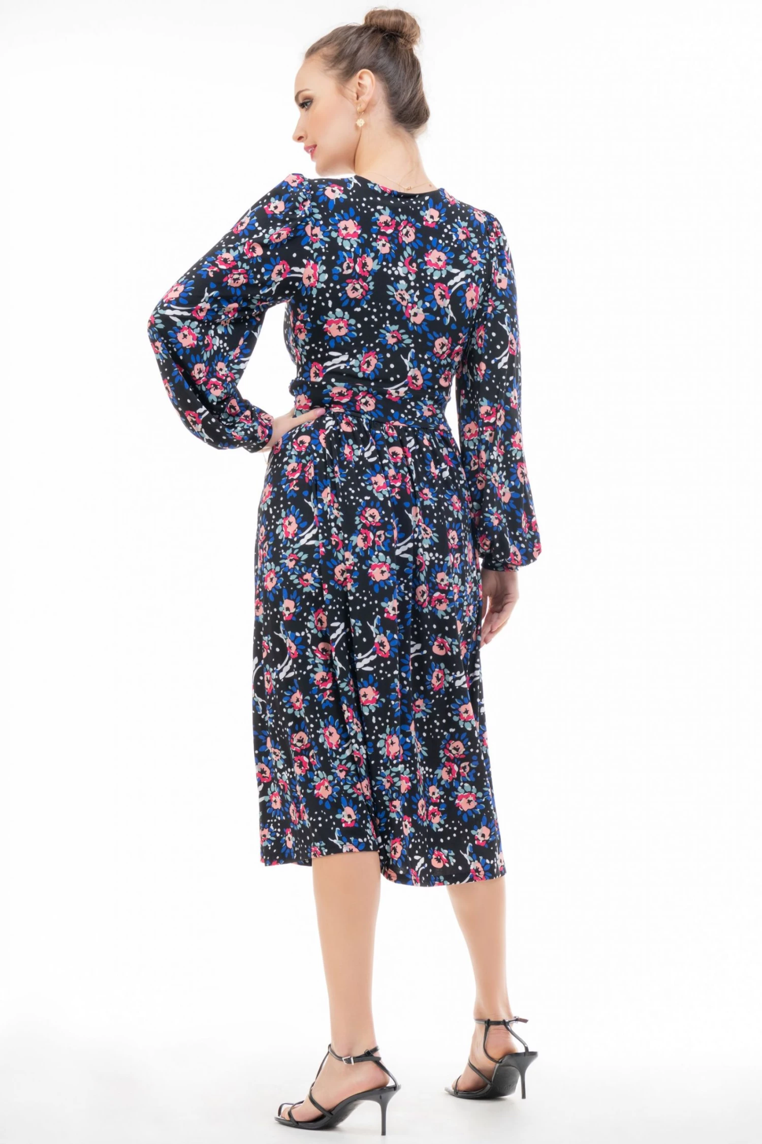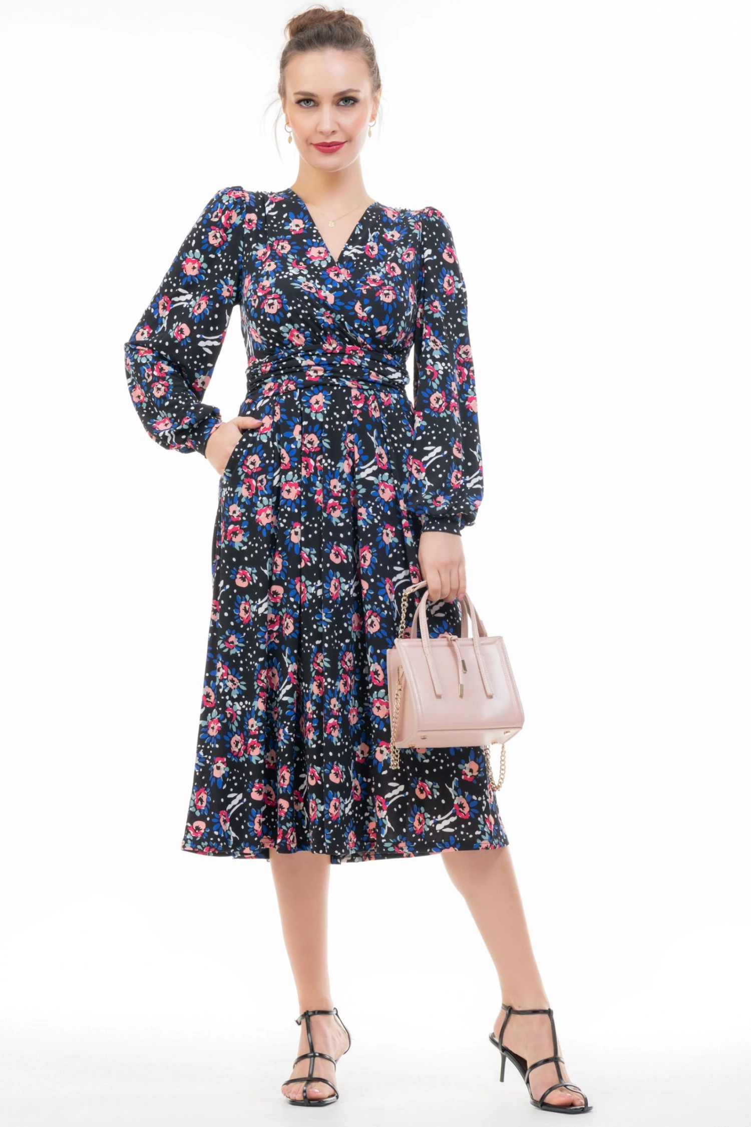 Complementing your shape with a wrap over front and puff long sleeves, this dress from Jolie Moi will become a real staple in your wardrobe. Flaring out at the hem for added movement, its elegant and stylish whilst having a pop of colour and youthful feel thanks to the contrast bold print that runs throughout.