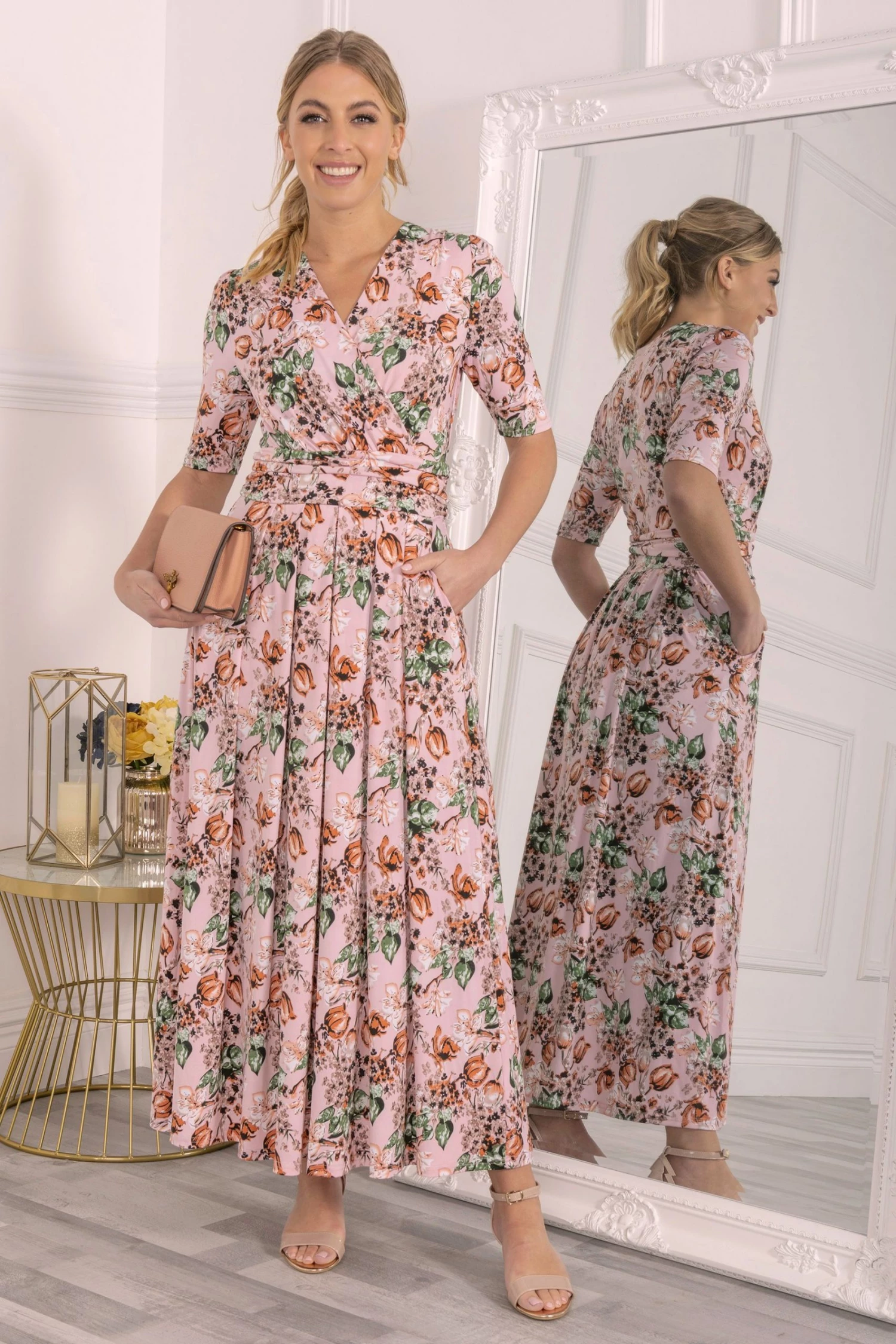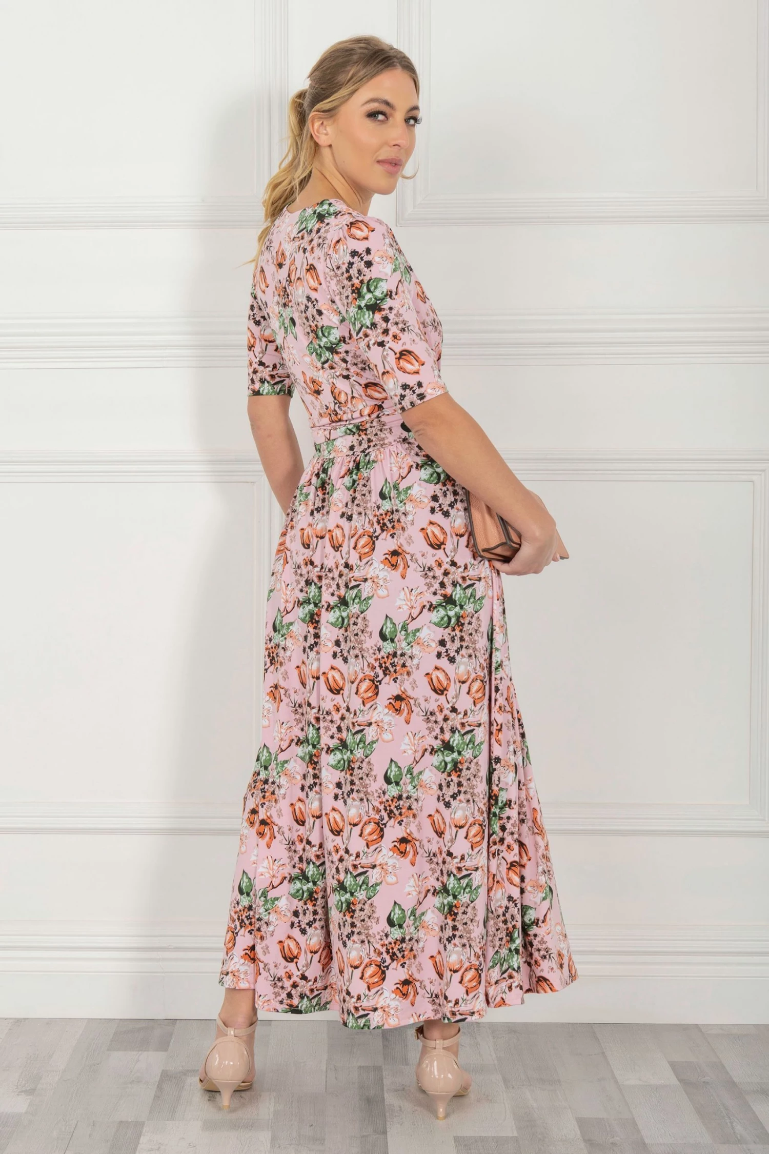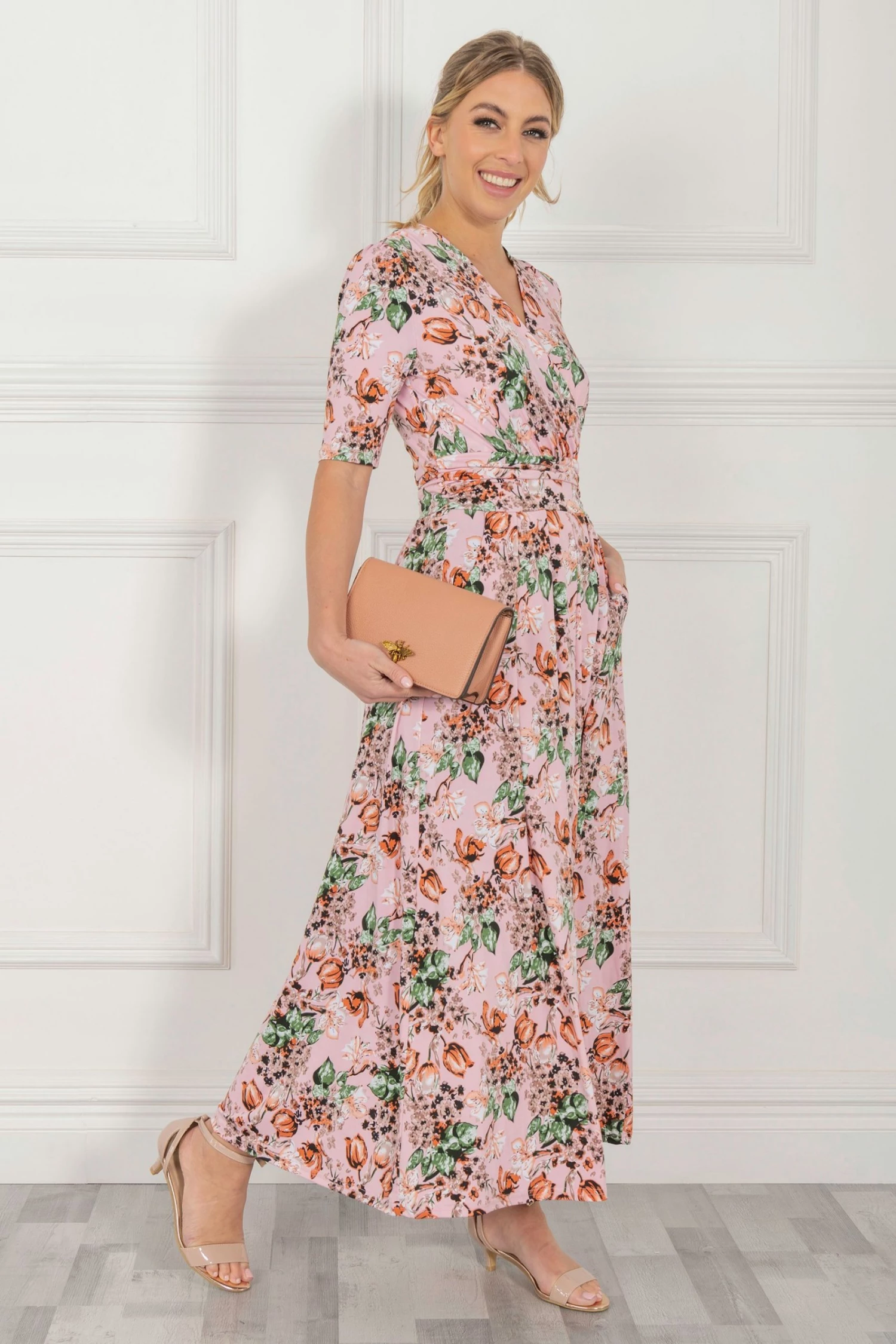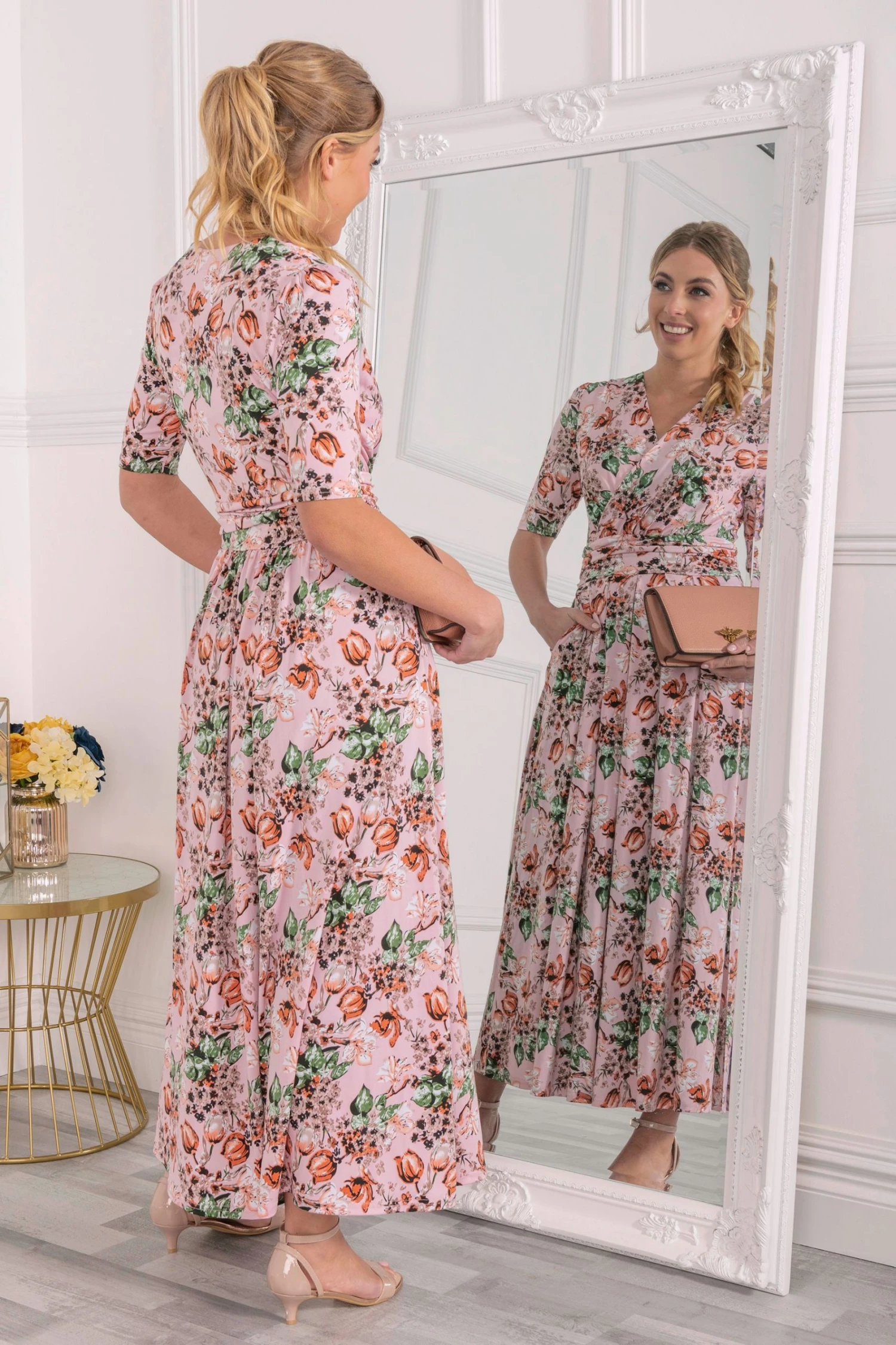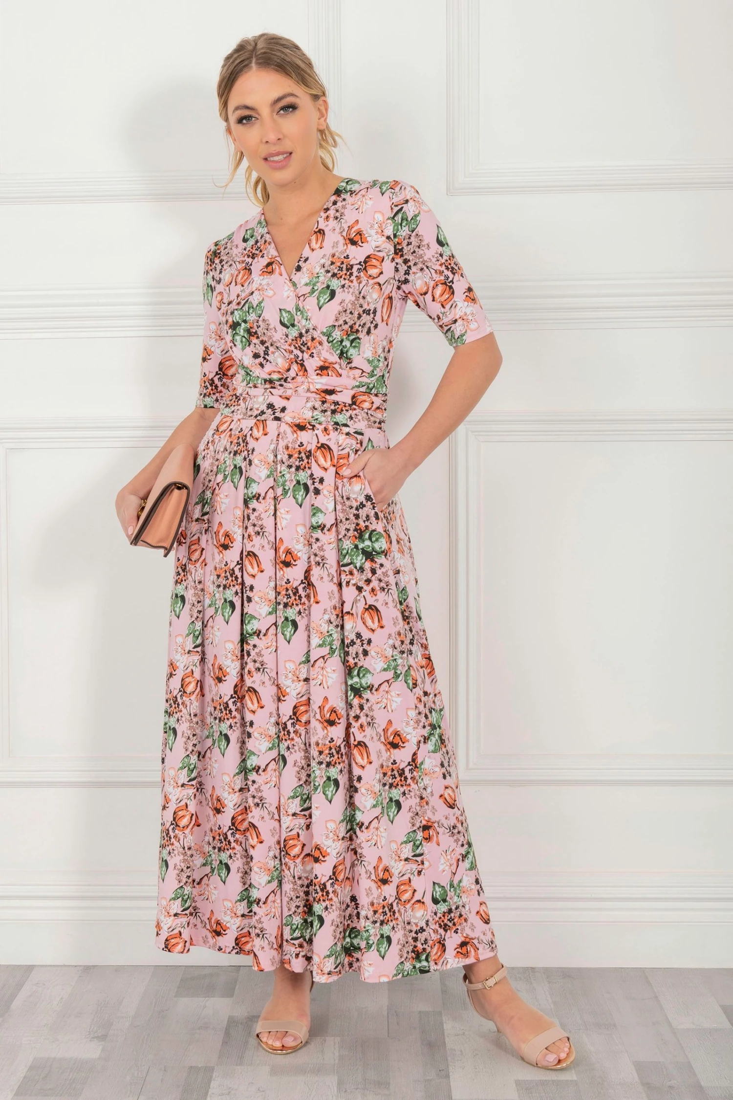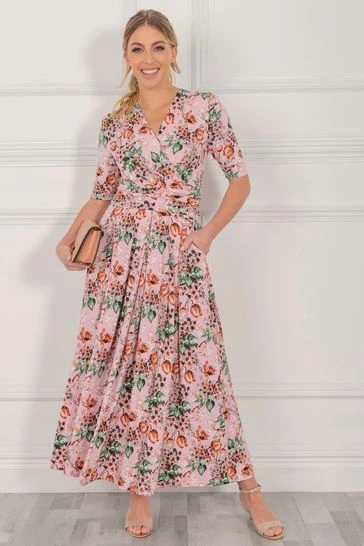 With a refined wrap front and flared hem, this maxi dress by Jolie Moi is brought to life with a floral print. Equipped with an elasticated waist to ensure a form-flattering silhouette, completed with a flattering V-neckline and short sleeves, it is made from a soft and fluid blended fabric and is a pretty piece you’ll reach for again and again.