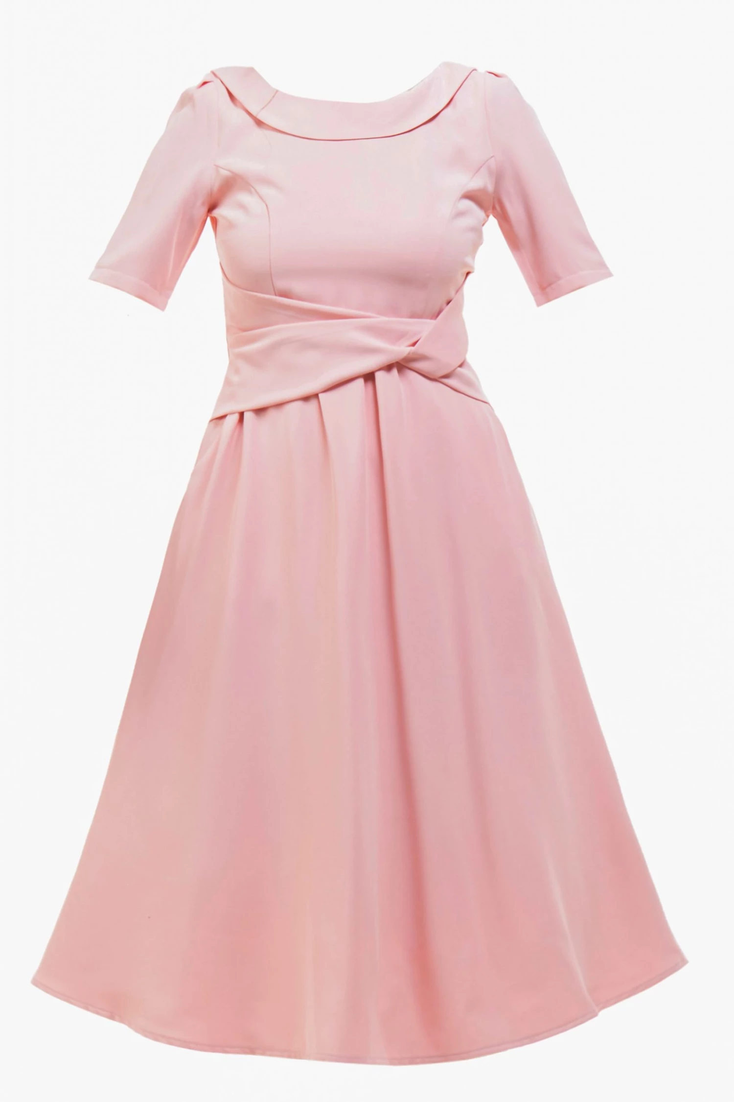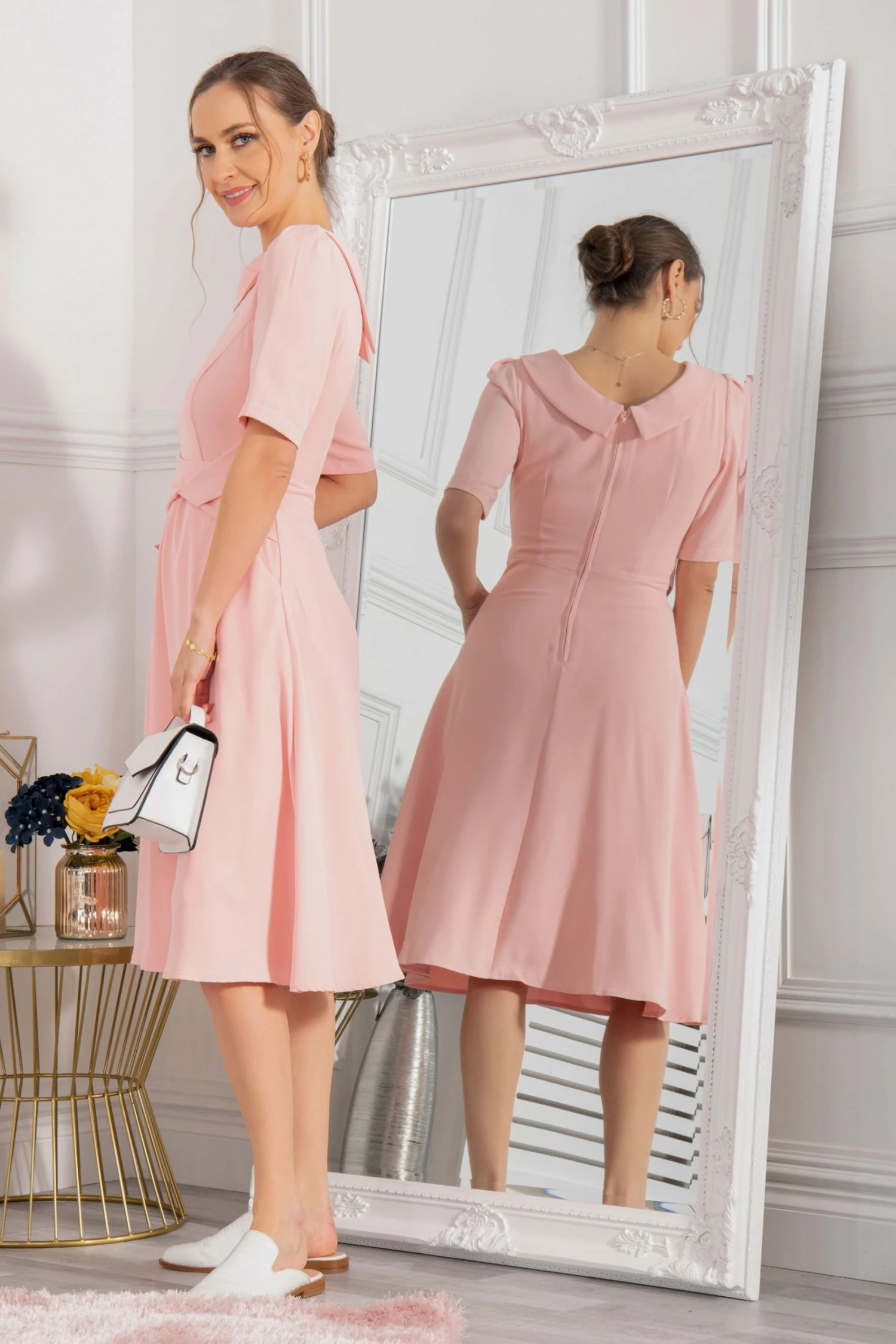 Make a glamorous entrance at your next special event with this sophisticated dress from Jolie Moi. Crafted from medium weight woven fabric with a hint of stretch, this 1950s look fit and flare dress designed with a statement curved fold-over collar is full of other details, from the twisted waistline and cropped sleeves. Fully lined for all-day comfort, it’s completed with concealed back zip and 2 practical side pockets.