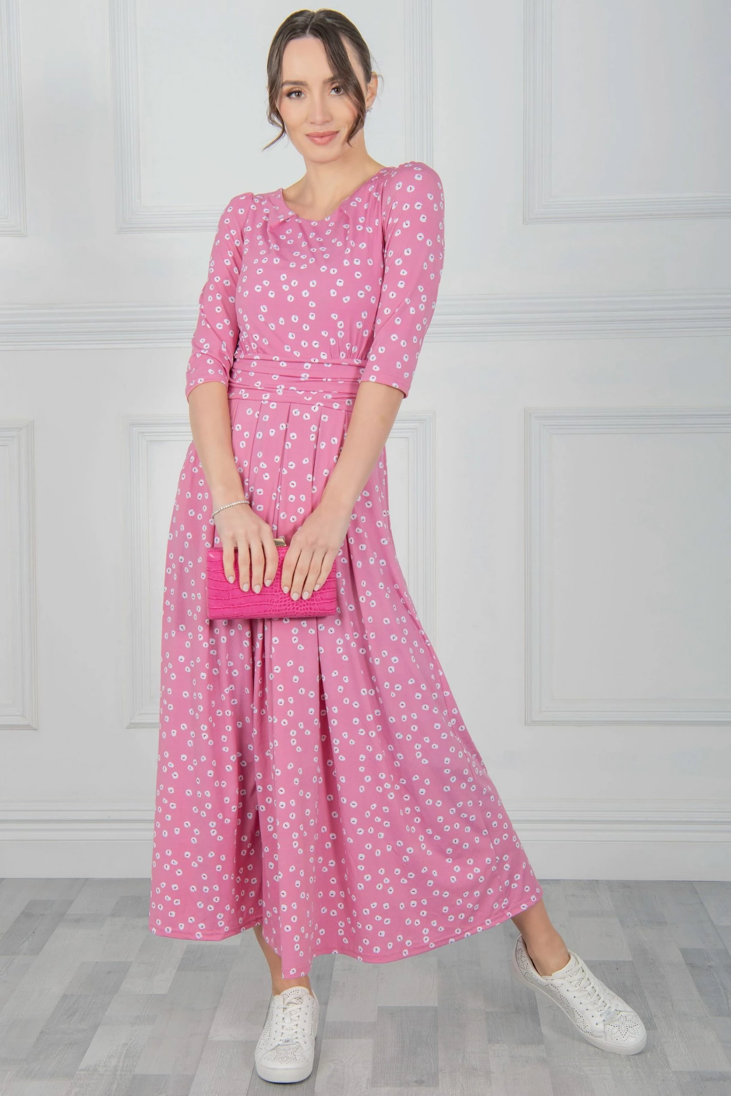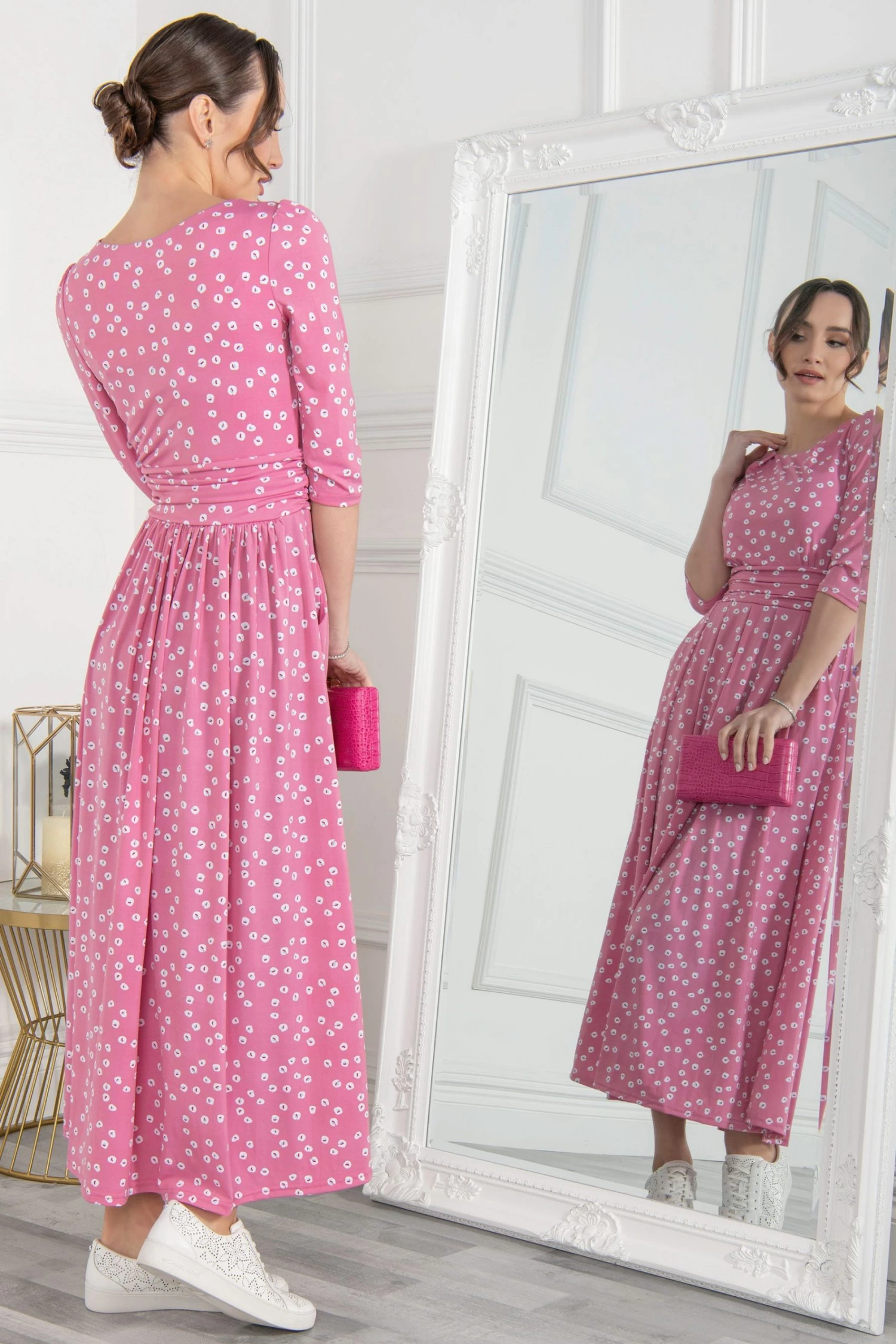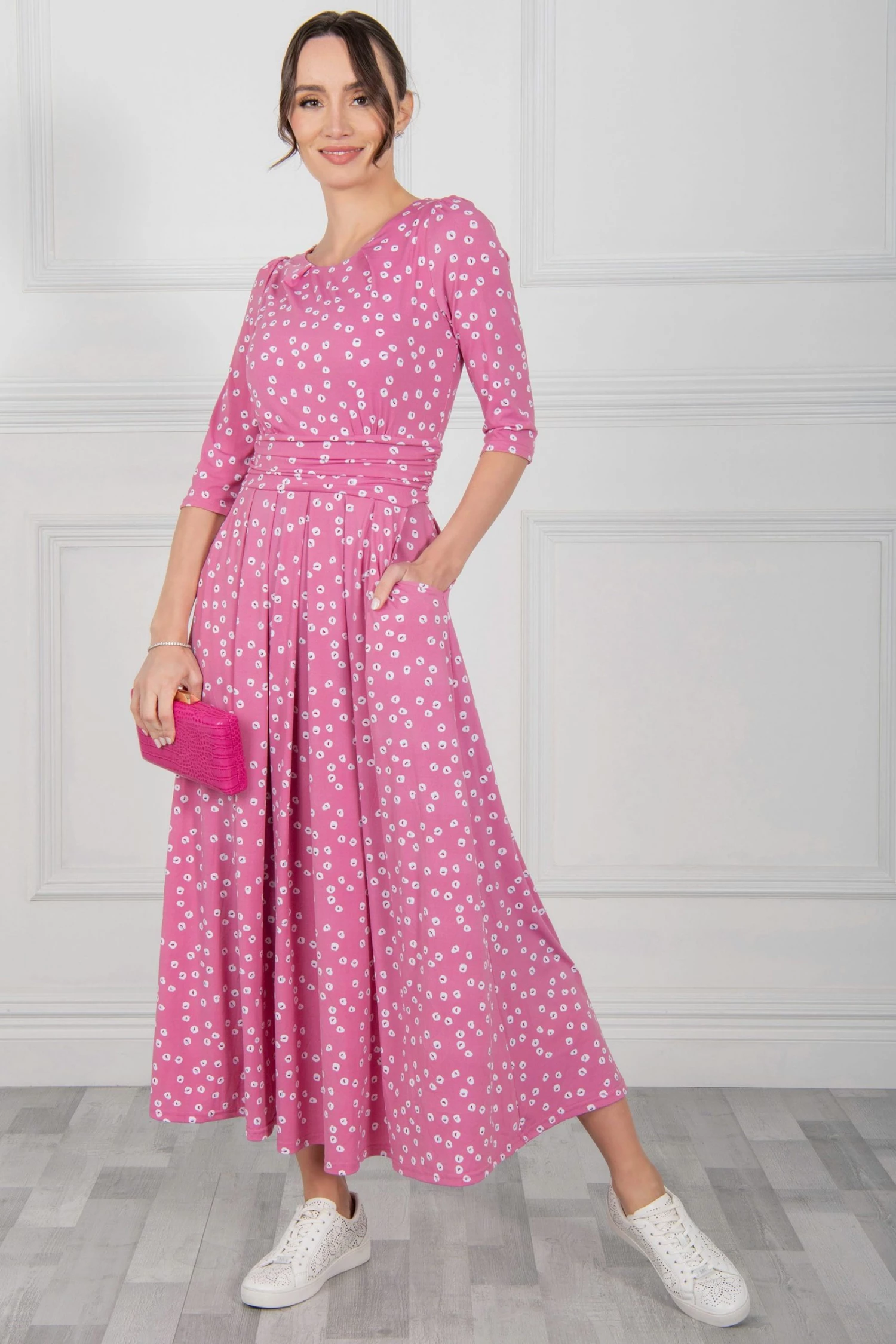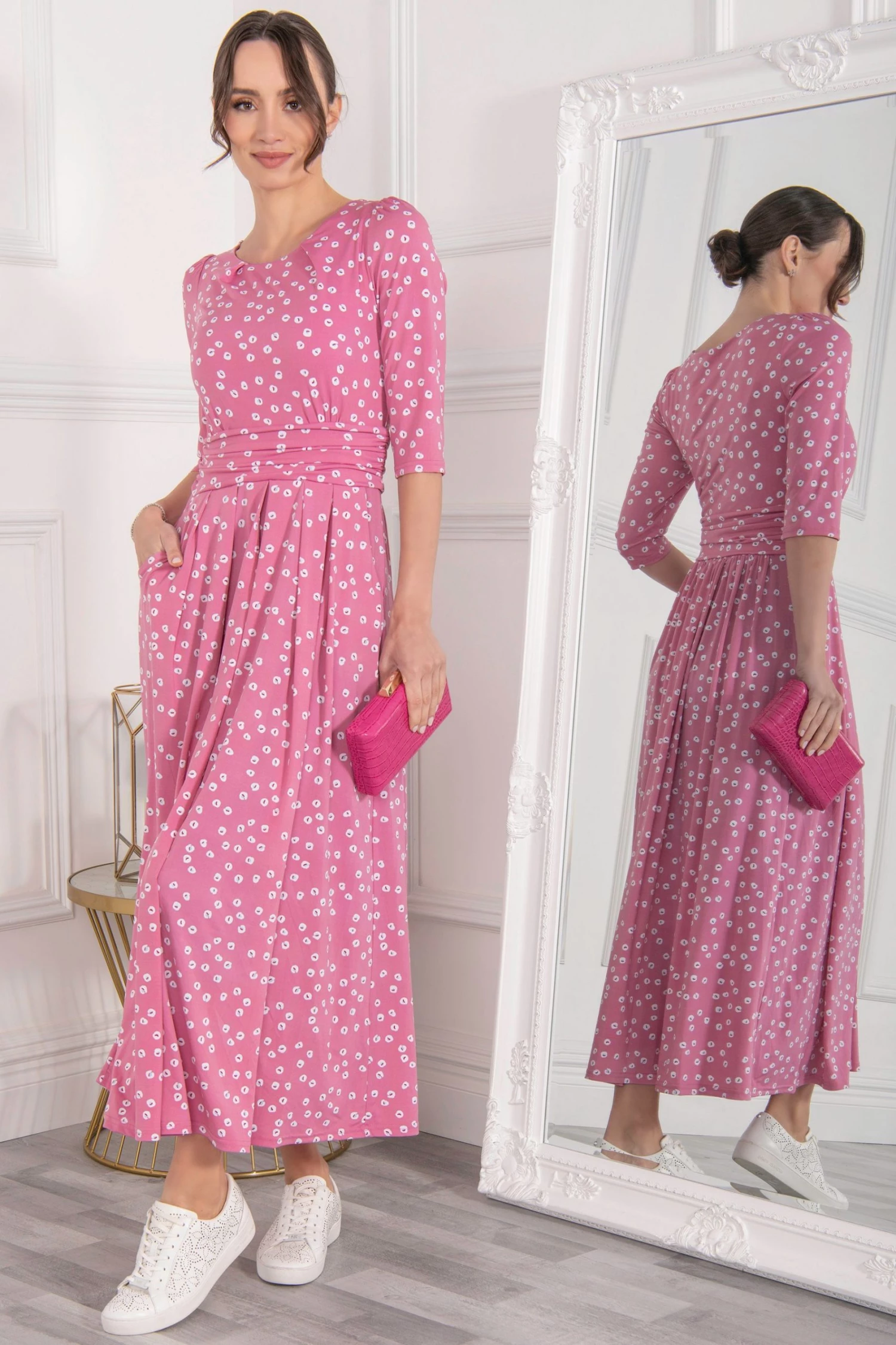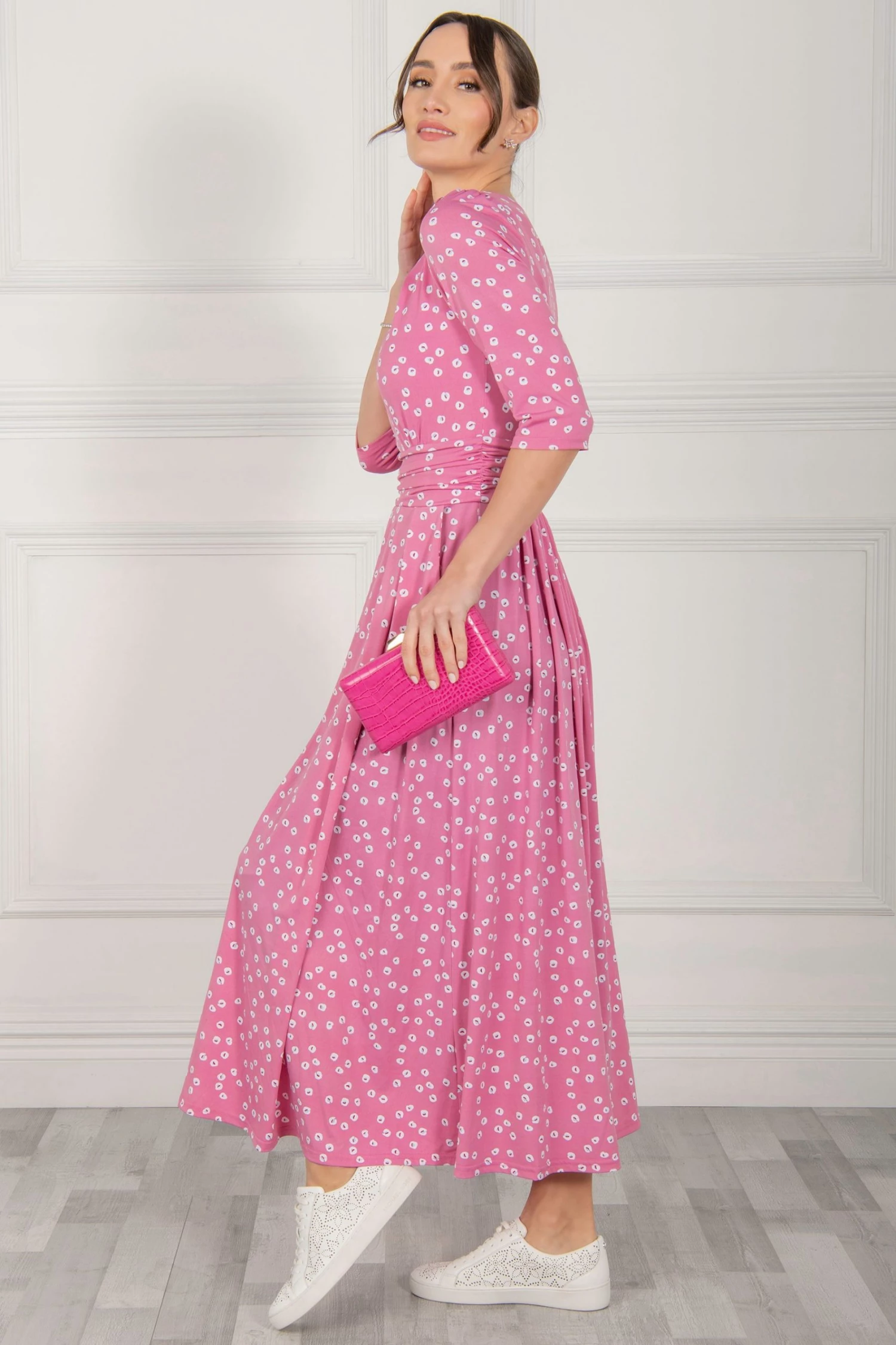 Easy to wear in an A-line silhouette, this maxi dress by Jolie Moi delivers a striking look with its bold spot print. With a simple scoop neck and three-quarter length sleeves, it is comfortable to slip on in a soft jersey blend fabric that is soft-to-touch and comfortable feel and exudes relaxed vibes for warm summer days.