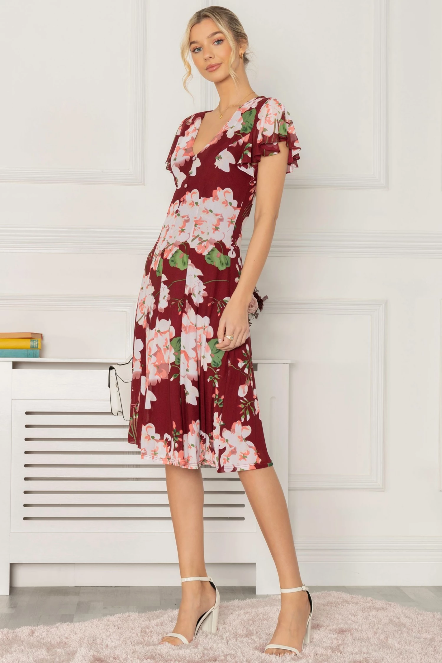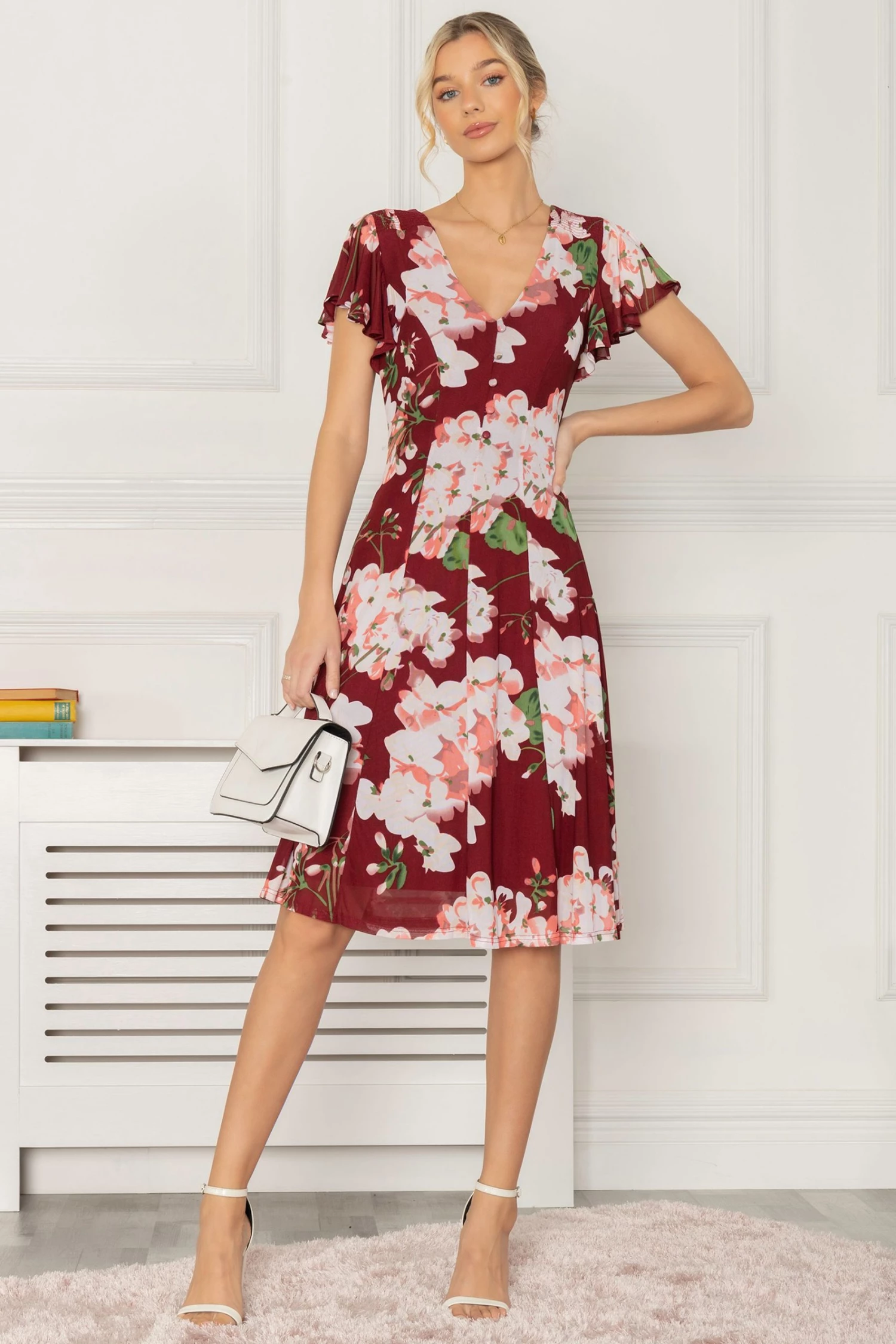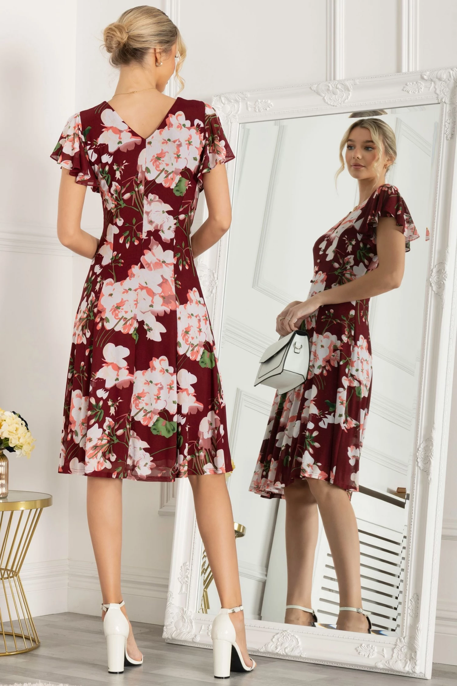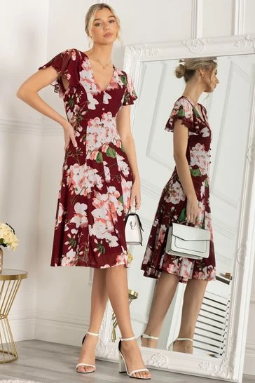 Exclusively by Jolie Moi. In a flattering fit-and-flare silhouette, this midi dress by Jolie Moi is cut from a premium mesh fabric with full lining. Accentuating the figure with a V-neckline and short angel sleeves, it has a beautiful floral pattern design that is perfect for a night with the girls and can be paired with a pair of heels or flats.