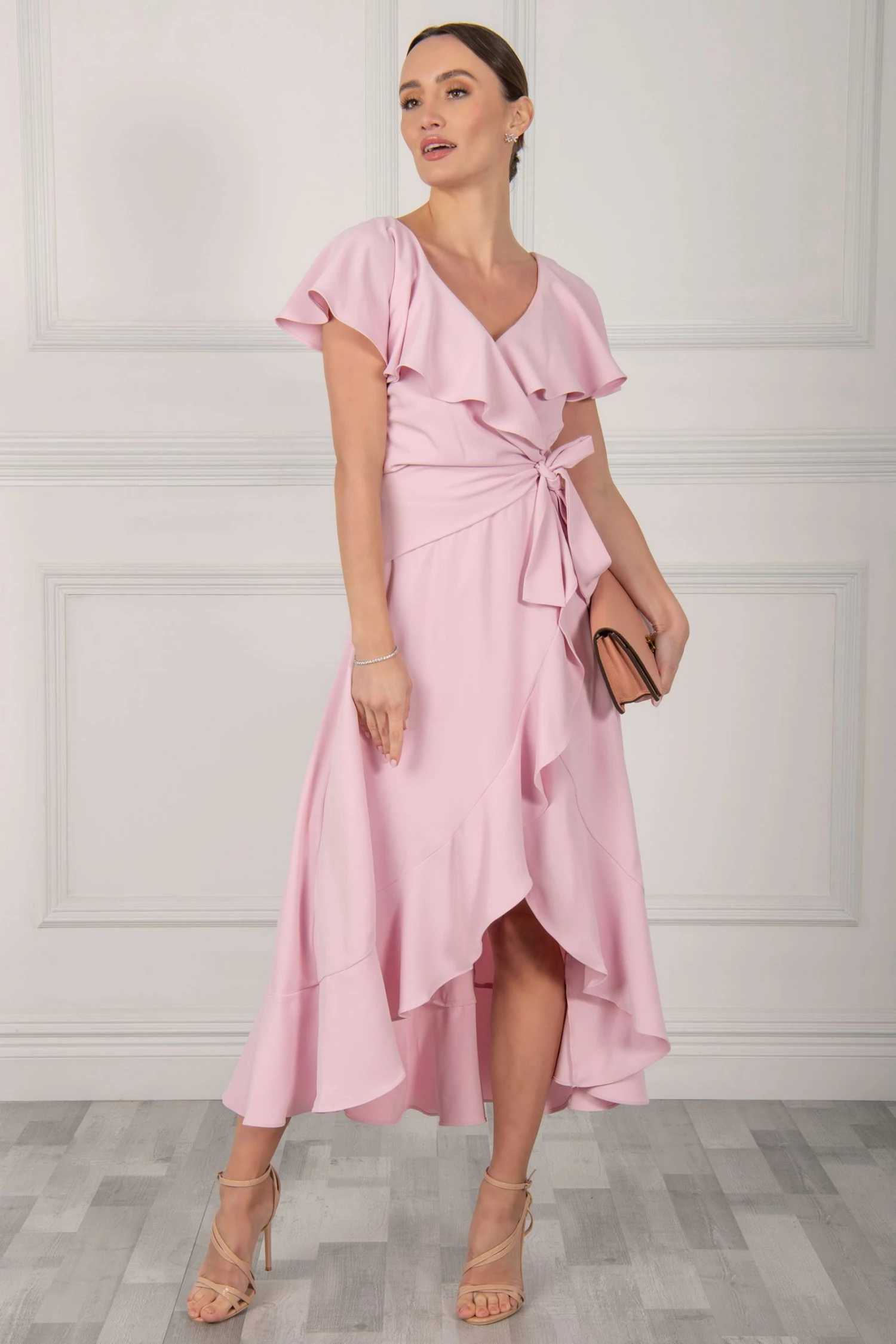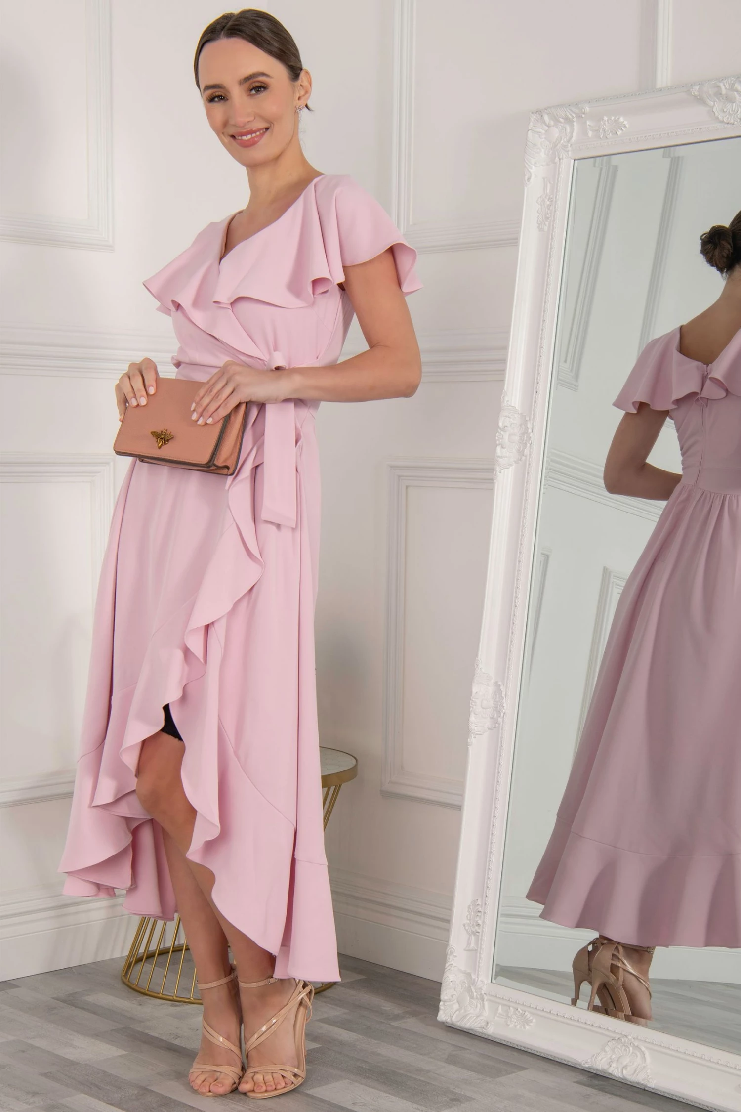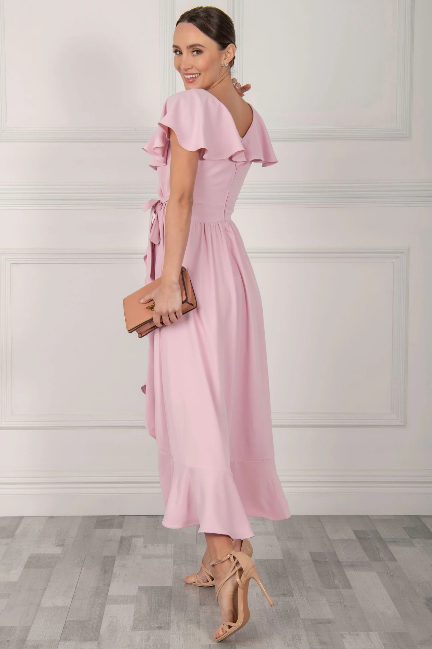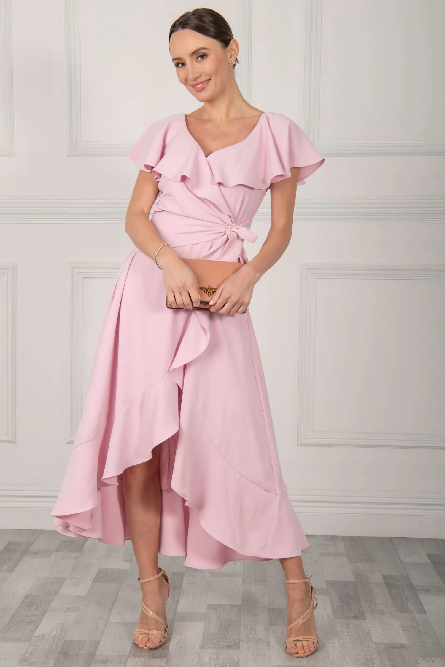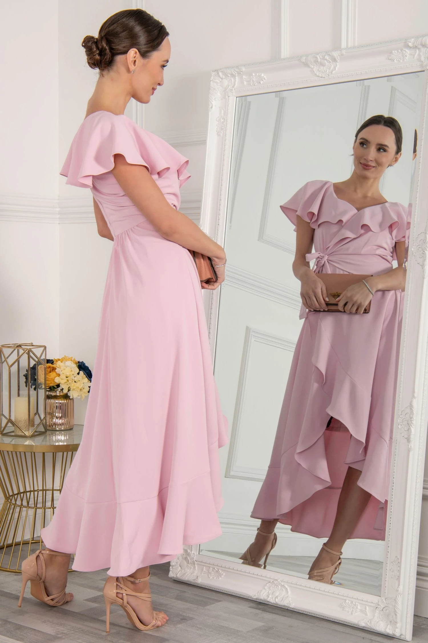 The Vella dress features a stunning high low frilly hem design, perfect for any glamorous occasion. The dress has a deep V-cut neckline with a shoulder to shoulder frilly accent which blends into the short sleeves. To complete the Vella dress we have added a beautiful ribbon belt for that wrapped look.