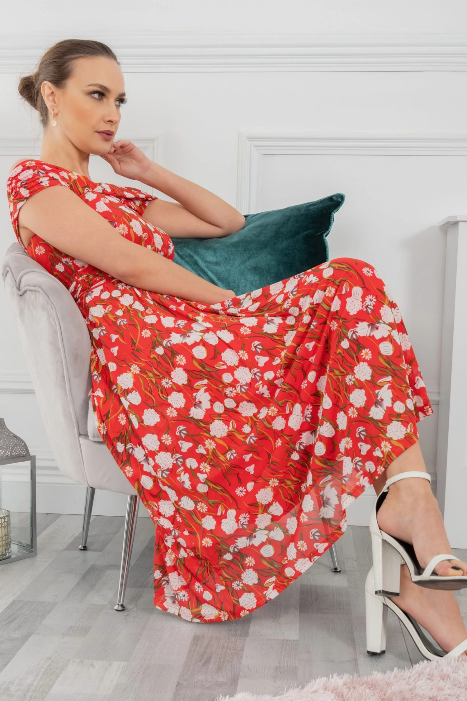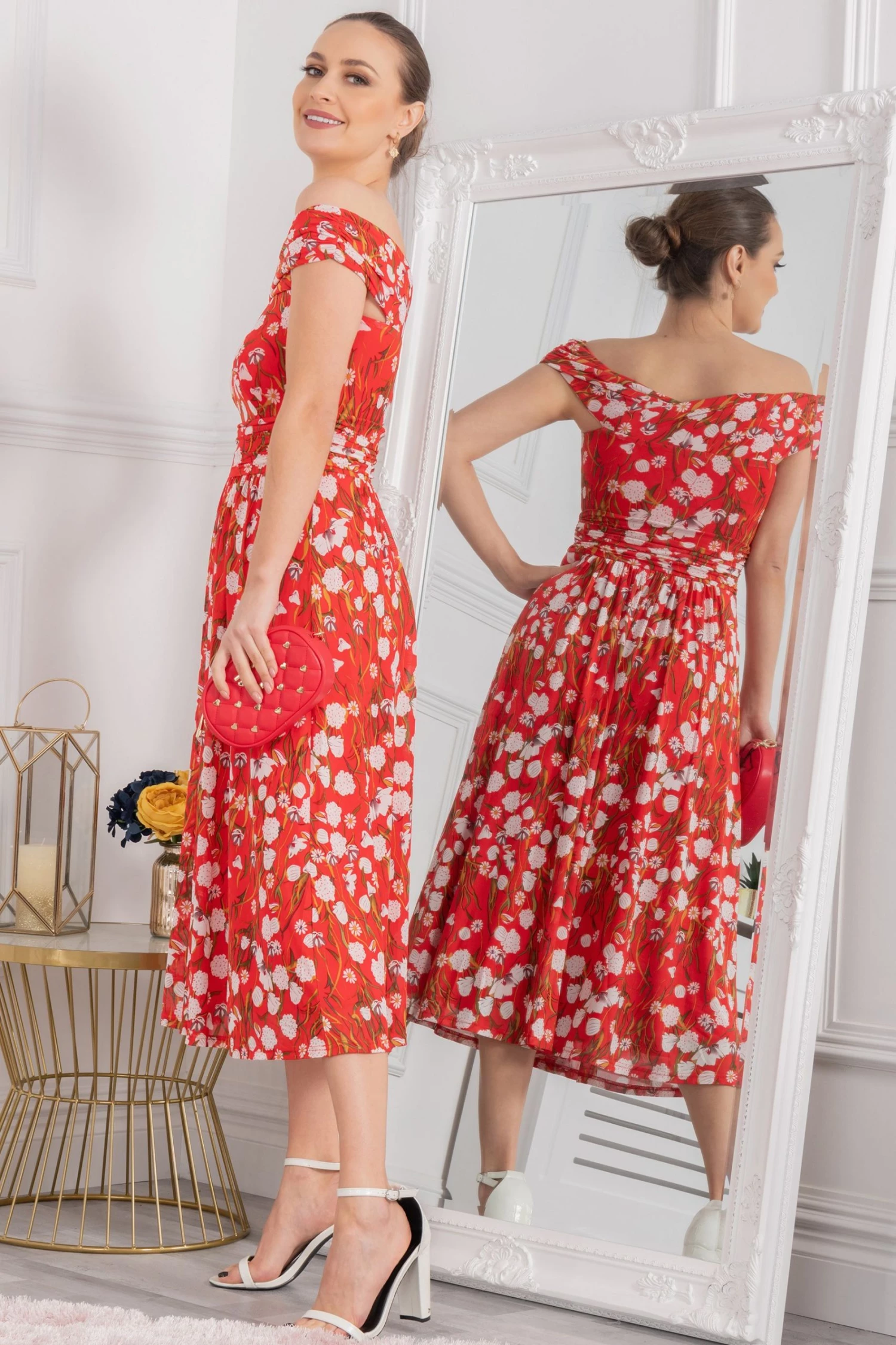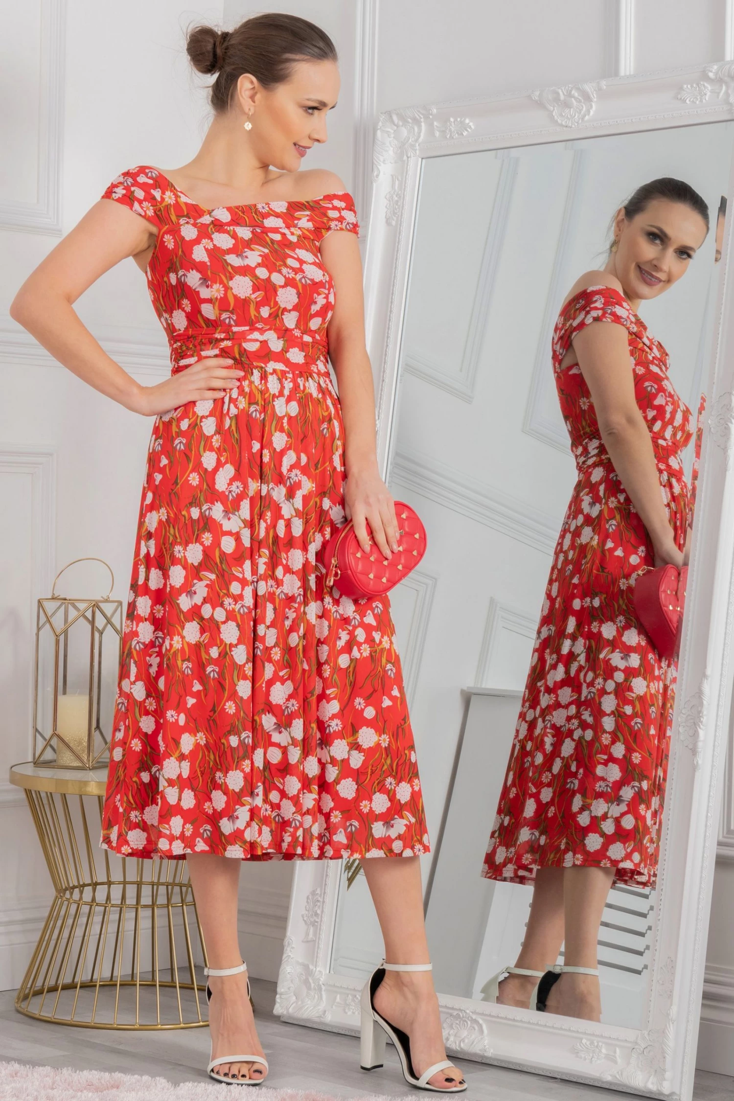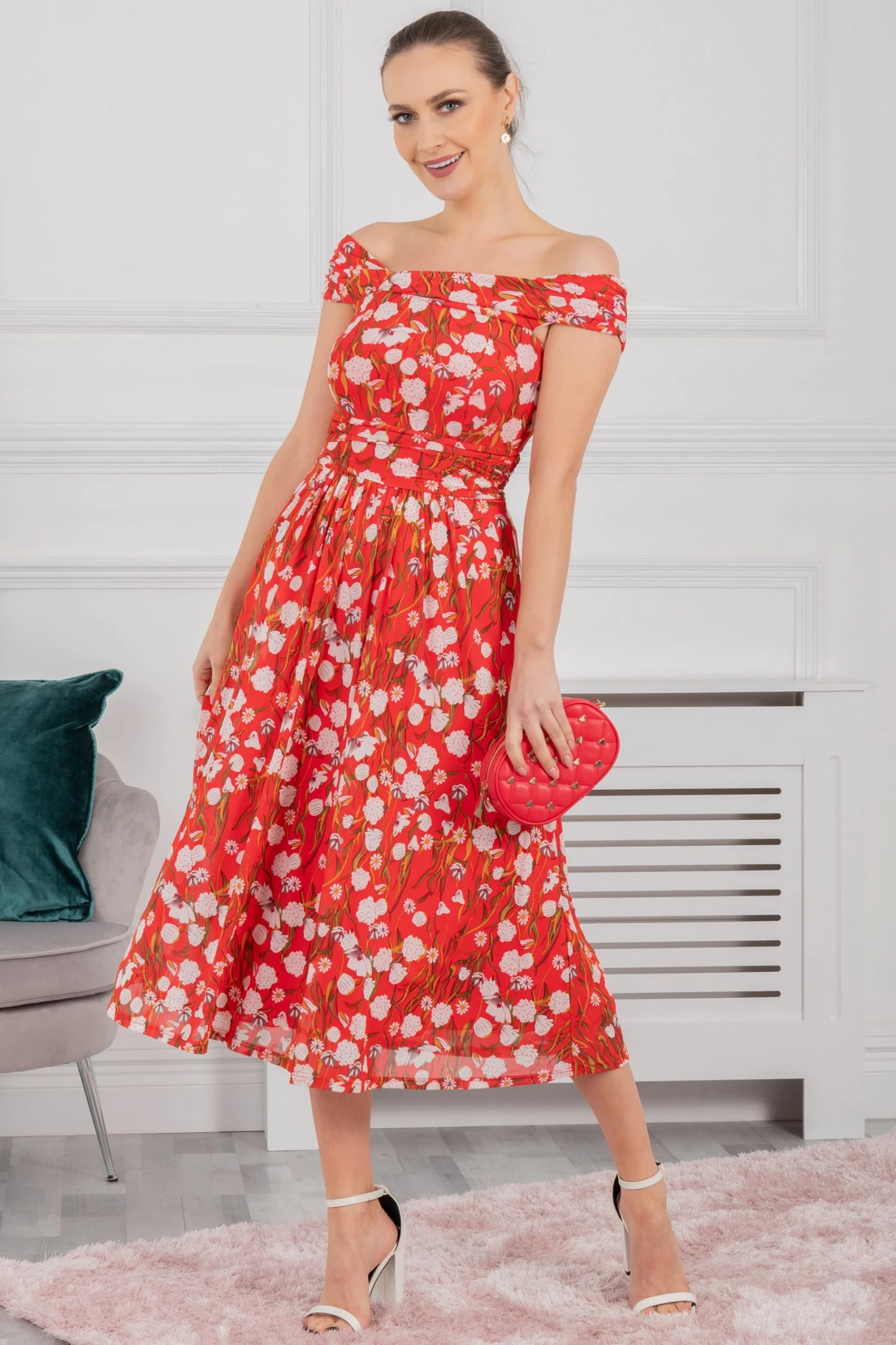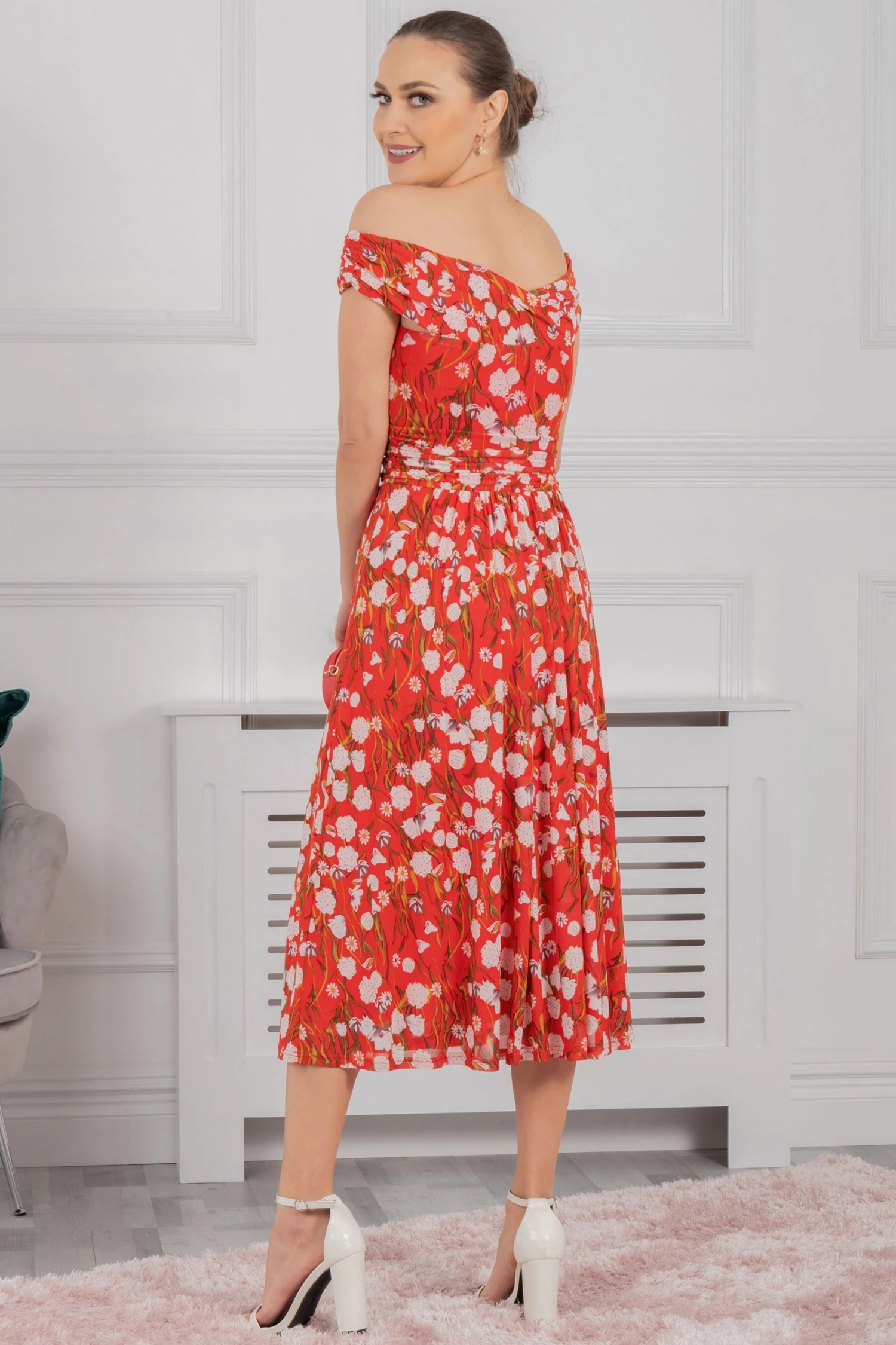Draped for ultimate sophistication, this midi dress from Jolie Moi sits off the shoulders with an alluring twist bardot neckline. It is made from a delicate mesh fabric with an overall floral print and nipped-in at the waist before flaring out through the skirt. Fully lined for comfort and finished with a pull on fastening, wear with metallic strappy heels to dazzle at your next occasion invite.
