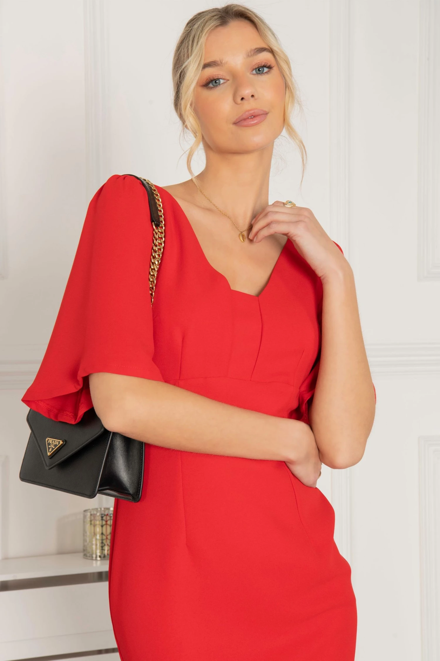 Introducing the Beverly to the Jolie Moi lineup this season. The dress features a stunning body con design that gives you a form-fitting silhouette. Fully lined for all-day comfort. Completed with a squared-off V-neck neckline and flared elbow-length sleeves. A perfect addition to your wardrobe for fancy dinners or a hot date. Guaranteed to wear time and time again.