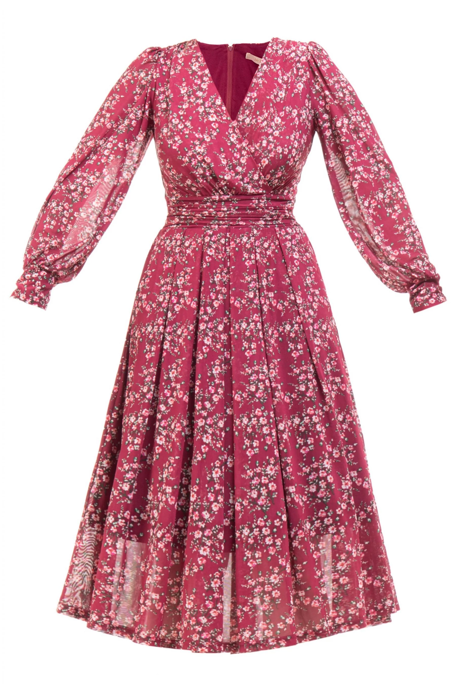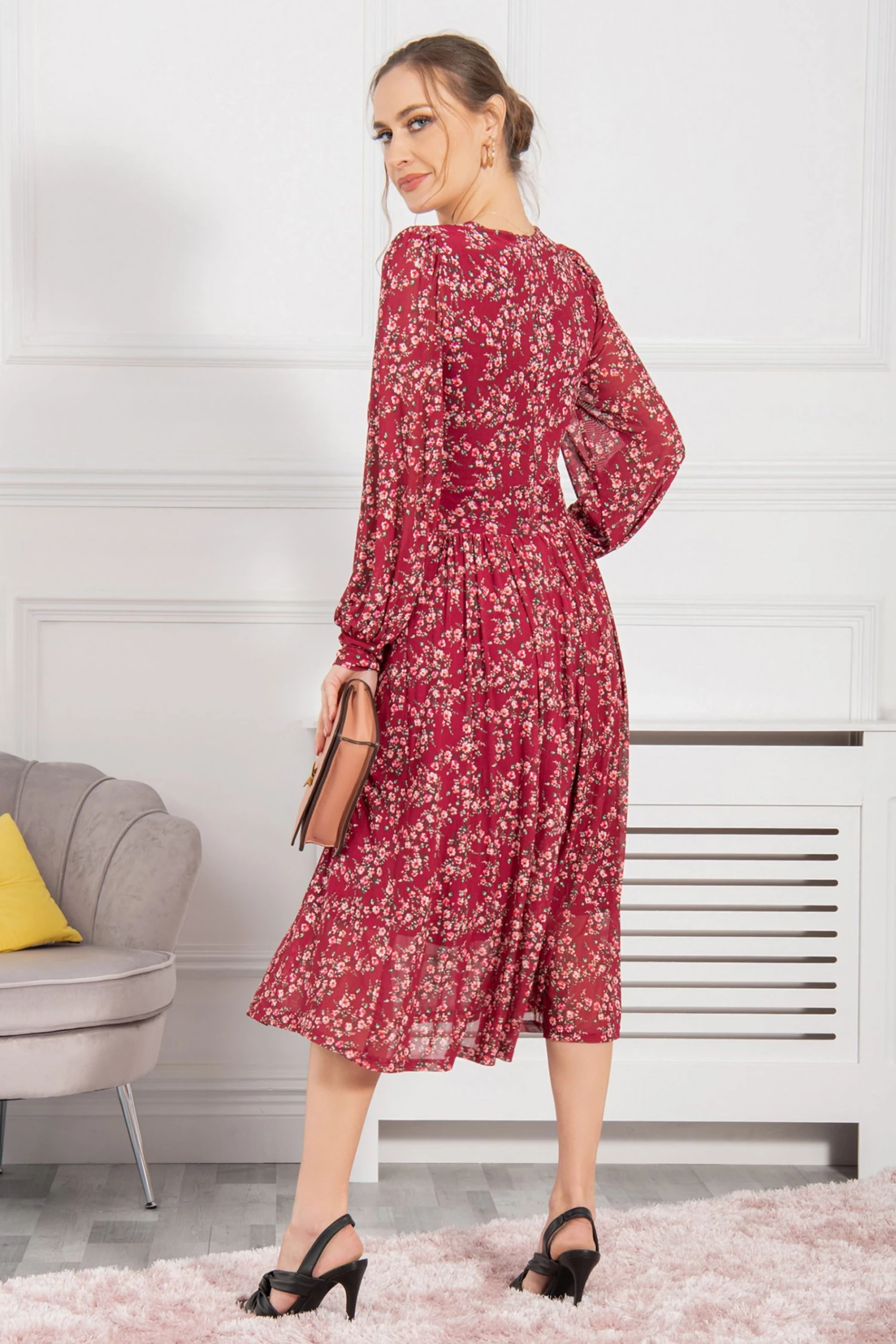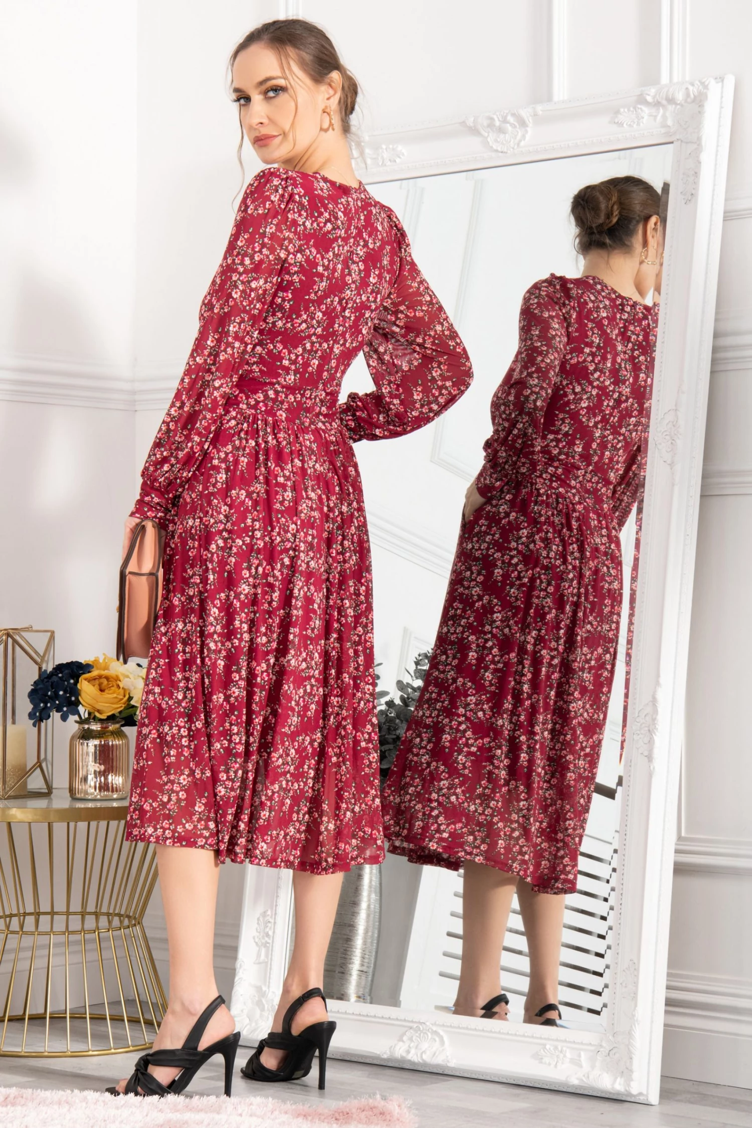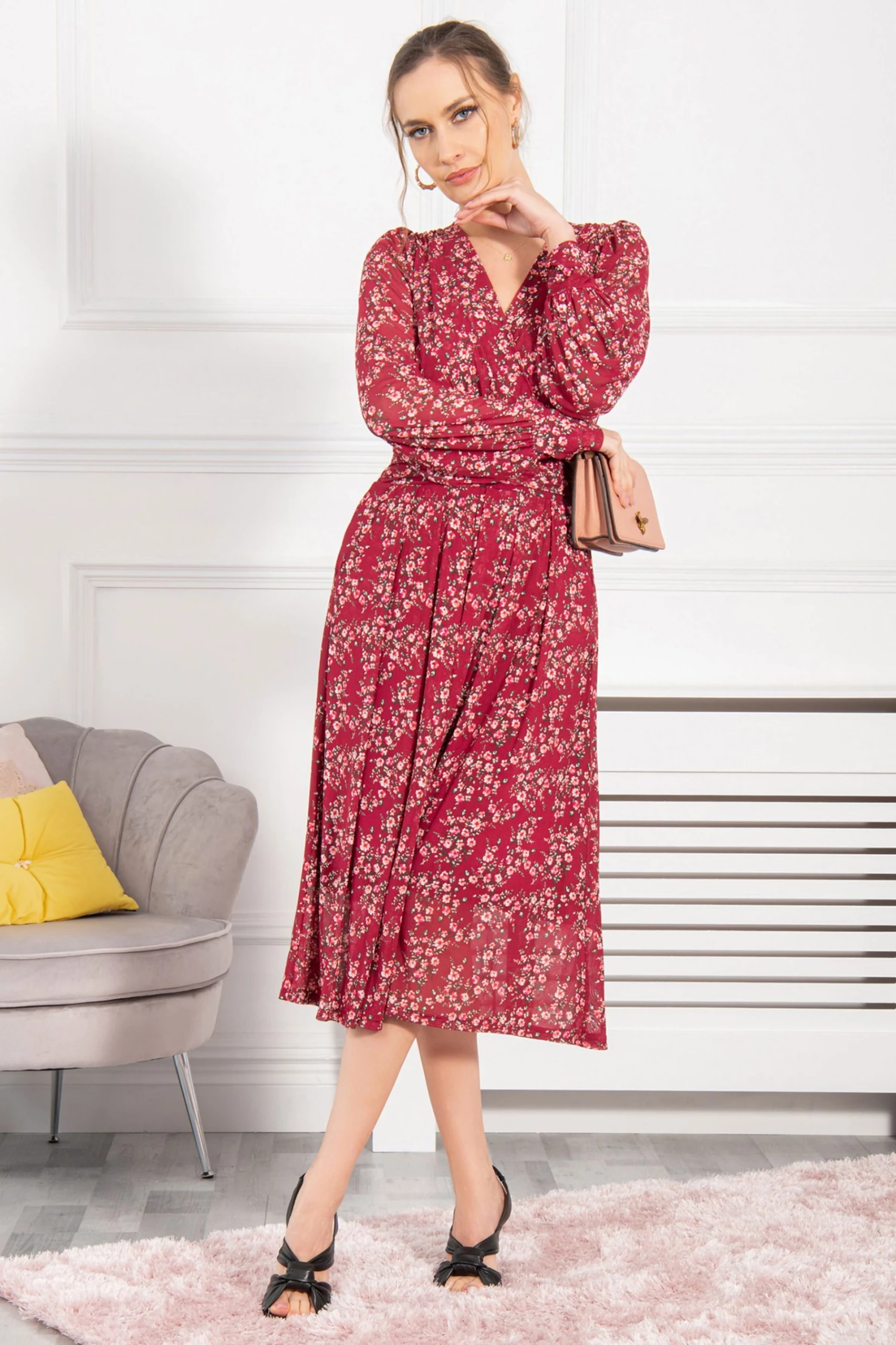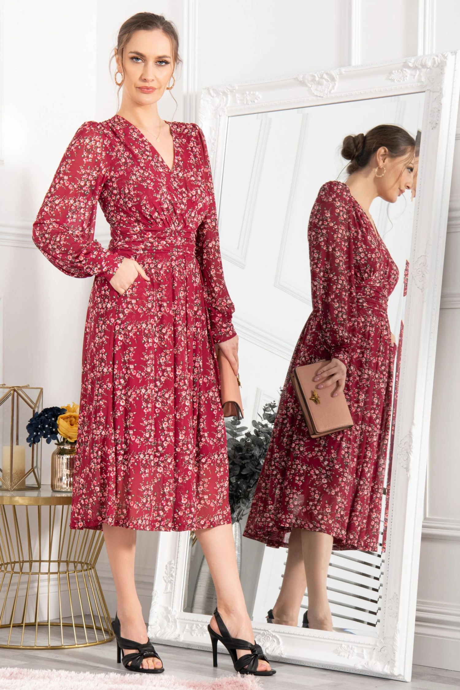 Flaring out at the hem for a feminine silhouette, this midi dress by Jolie Moi boasts a floral flourish for added appeal. With a wrap-over front and long sleeves, it will see you through wedding events and those special occasions with ease.