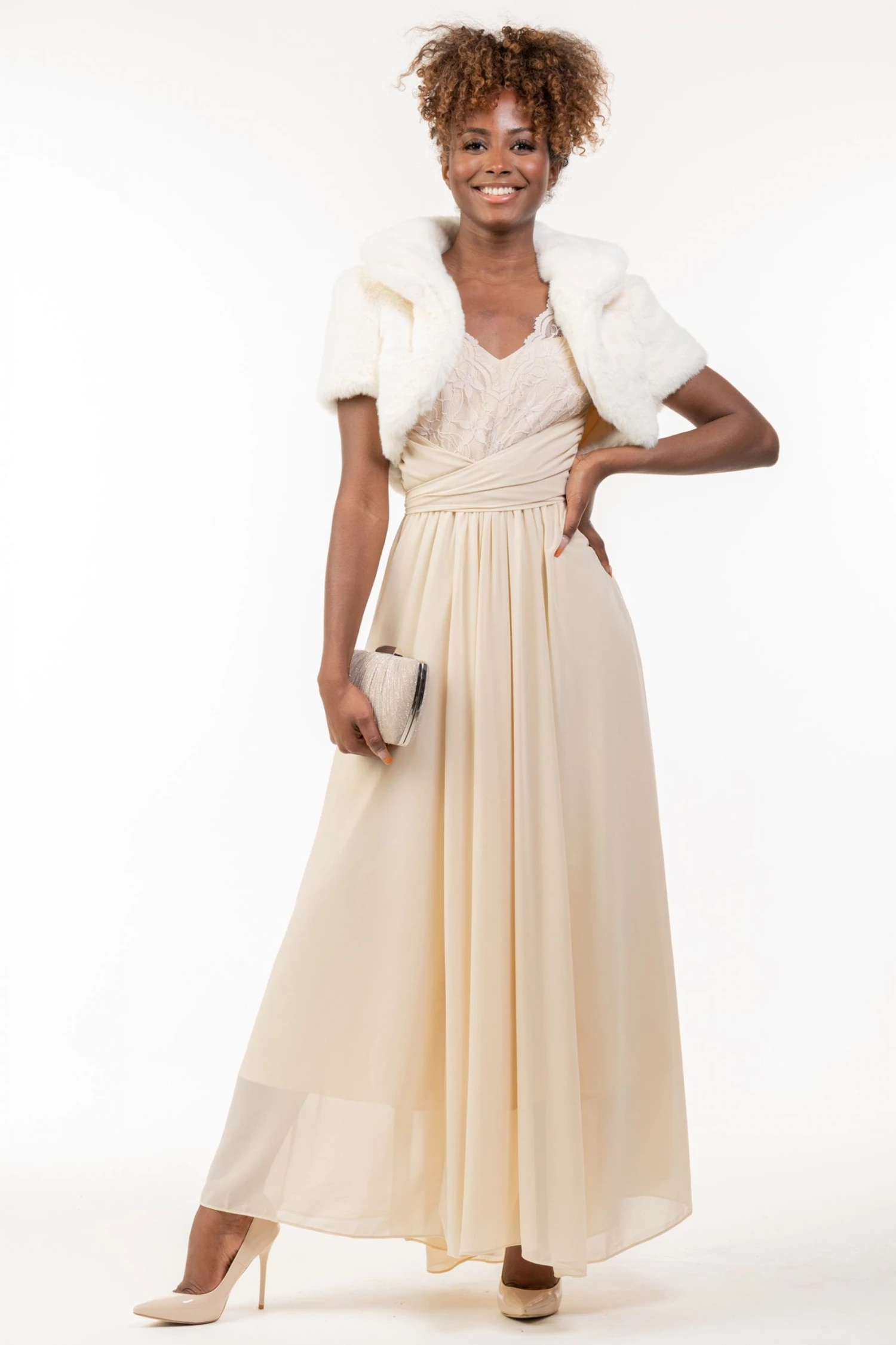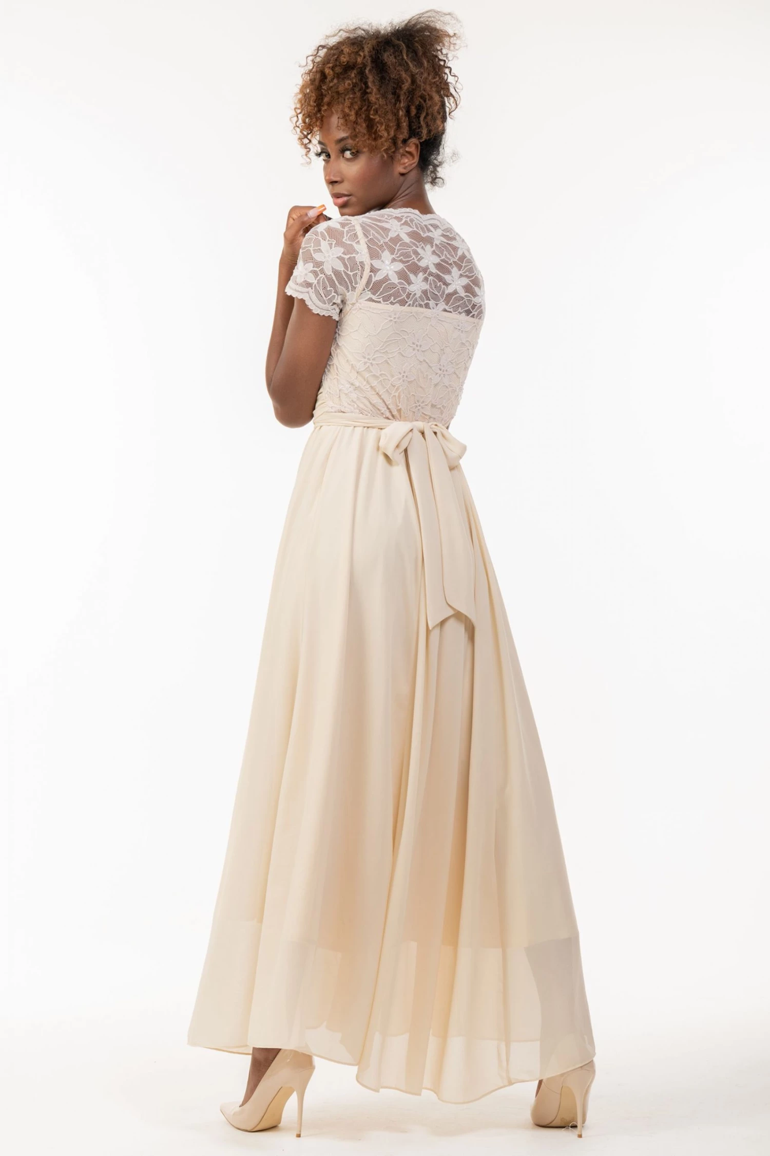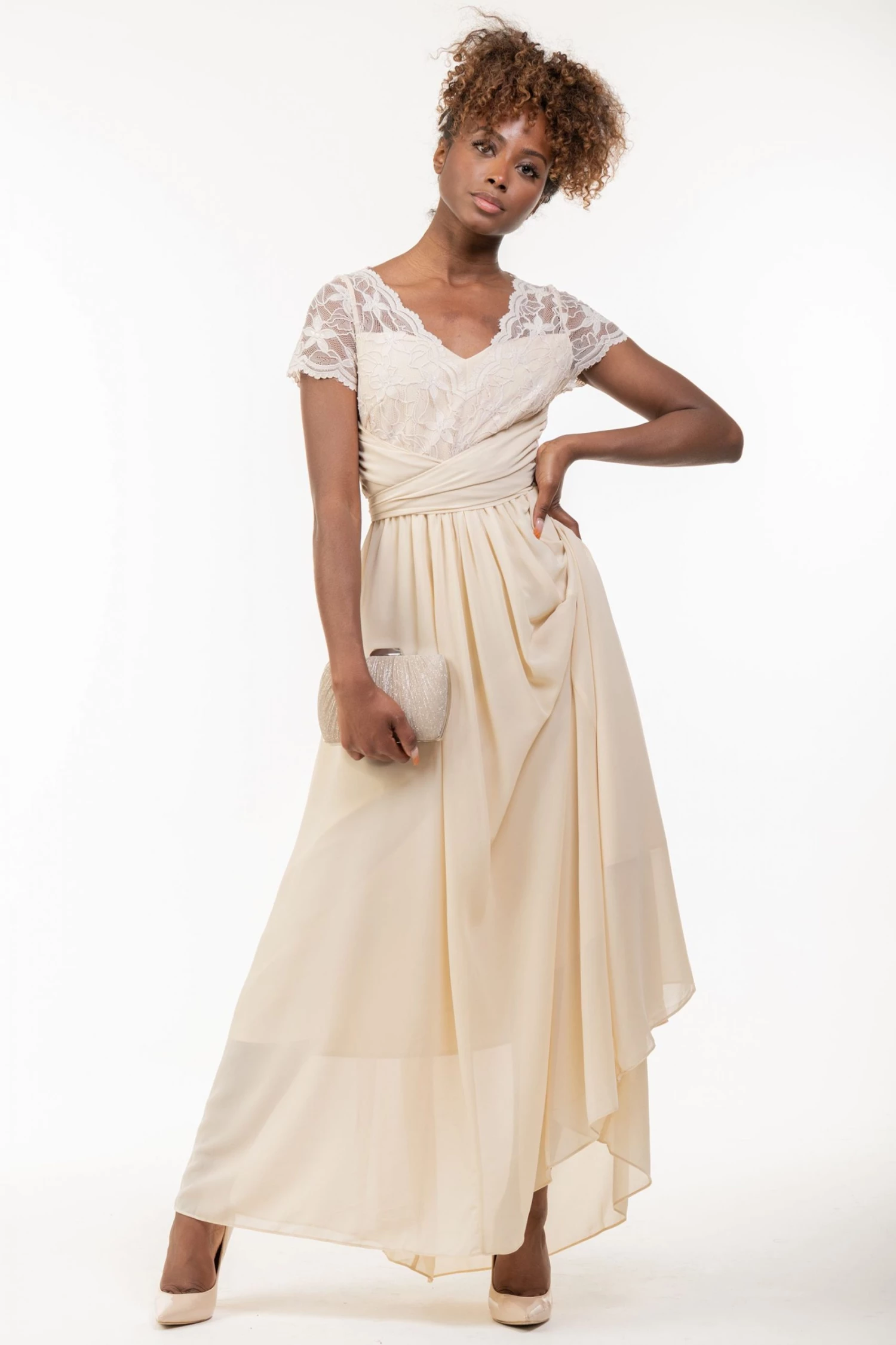 Crafted to a fluid, sweeping floor-length cut, this stunning dress from Jolie Moi is designed in a flattering fit and flare style. It features a contrasting lace bodice with a scalloped V-neckline, a flared maxi skirt, and a crossover tie around the waist. Lined through the bodice, this piece pulls on for easy wear. Elevate the look with strap-heeled sandals and a box clutch bag.